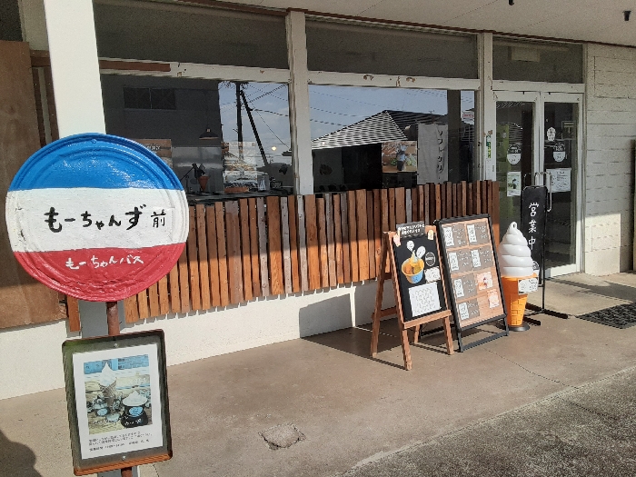 菊池市(きくちし)国道387号線から住宅街交差点沿いにある「もーちゃんず」バス亭っぽい遊び心ある看板とのぼり旗が目印なのですが、土地勘がない慣れない人は迷ってしまうかも知れませんけぇグーグルマップを参考に安全運転でお出かけつかぁさい。店舗前に駐車スペースがあります。