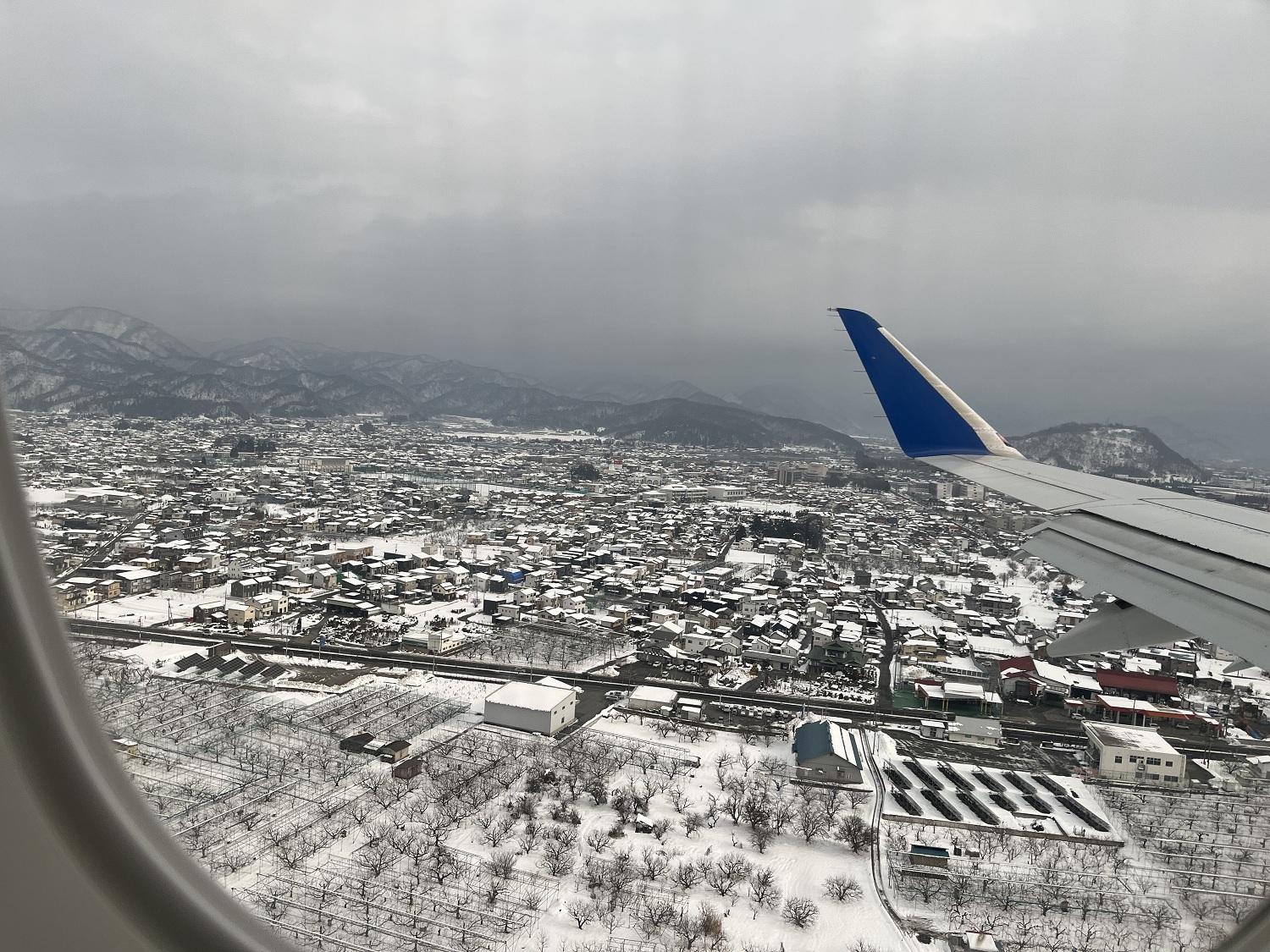 着陸態勢に入った機窓から見えるのは、白銀のパッチワークのような東根の町並み。空から見ると静止しているように見えるその景色のなかでは、実は驚くべき職人技が動いています。