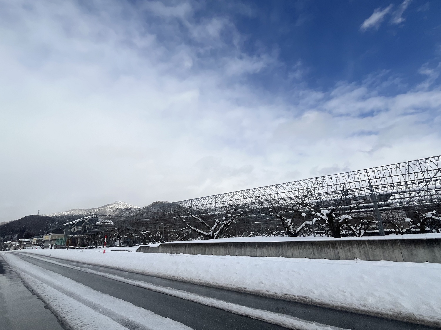 ふと窓の外に目を向ければ、そこには文字通りの「山形」を描く山の稜線。そして、さくらんぼ王国・東根を象徴する果樹園のビニールハウスが、雪のなかに静かに並んでいます。