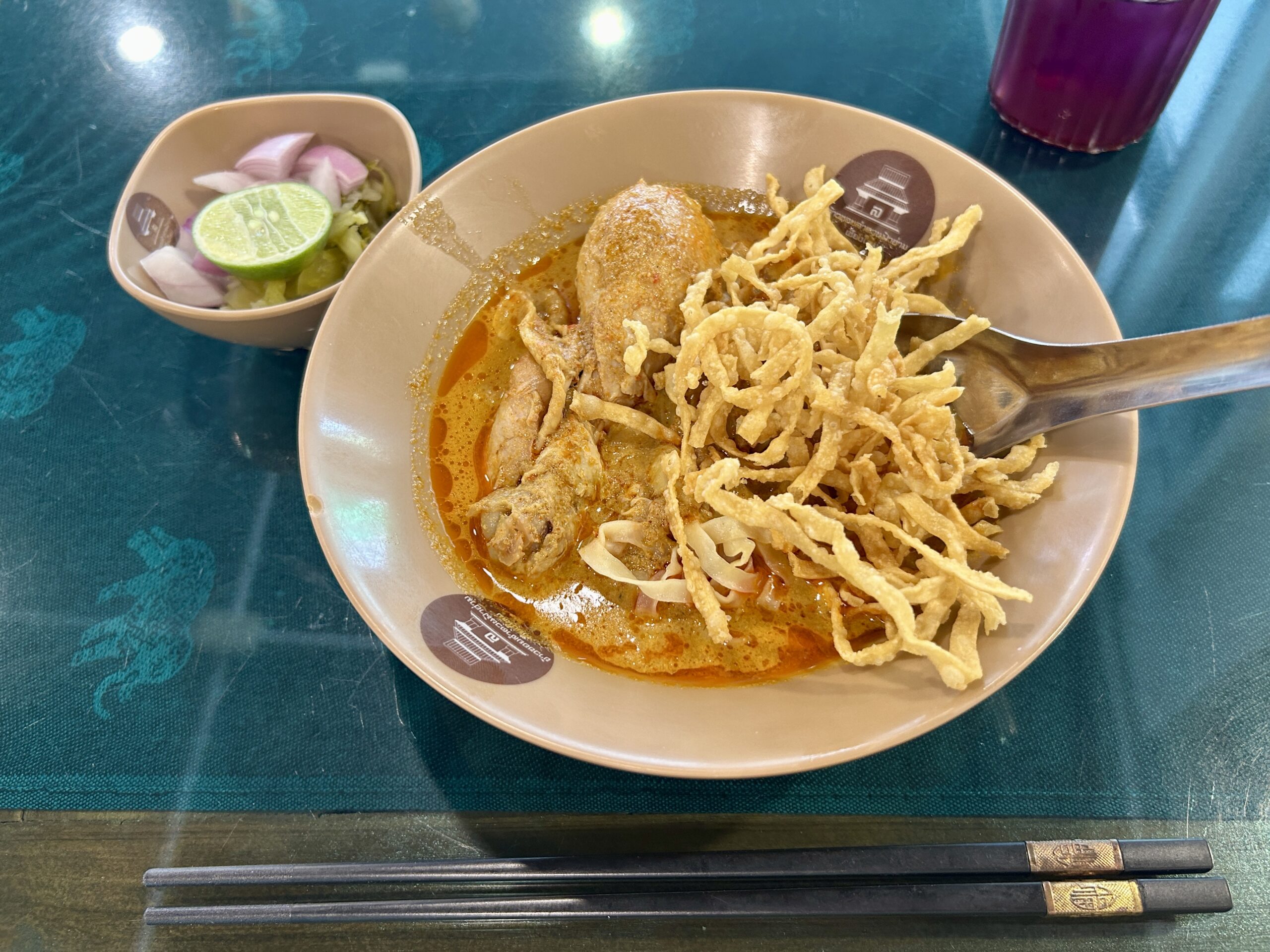 この鶏が驚くほどやわらかく、まろやかなカレースープが沁み込み、どこか懐かしい味わい。そして上にのっているパリパリに揚げた麺とスープも絶妙。価格は75バーツ(2026年1月時点で370円くらい)で、バーツ高といってもお手頃な価格です。