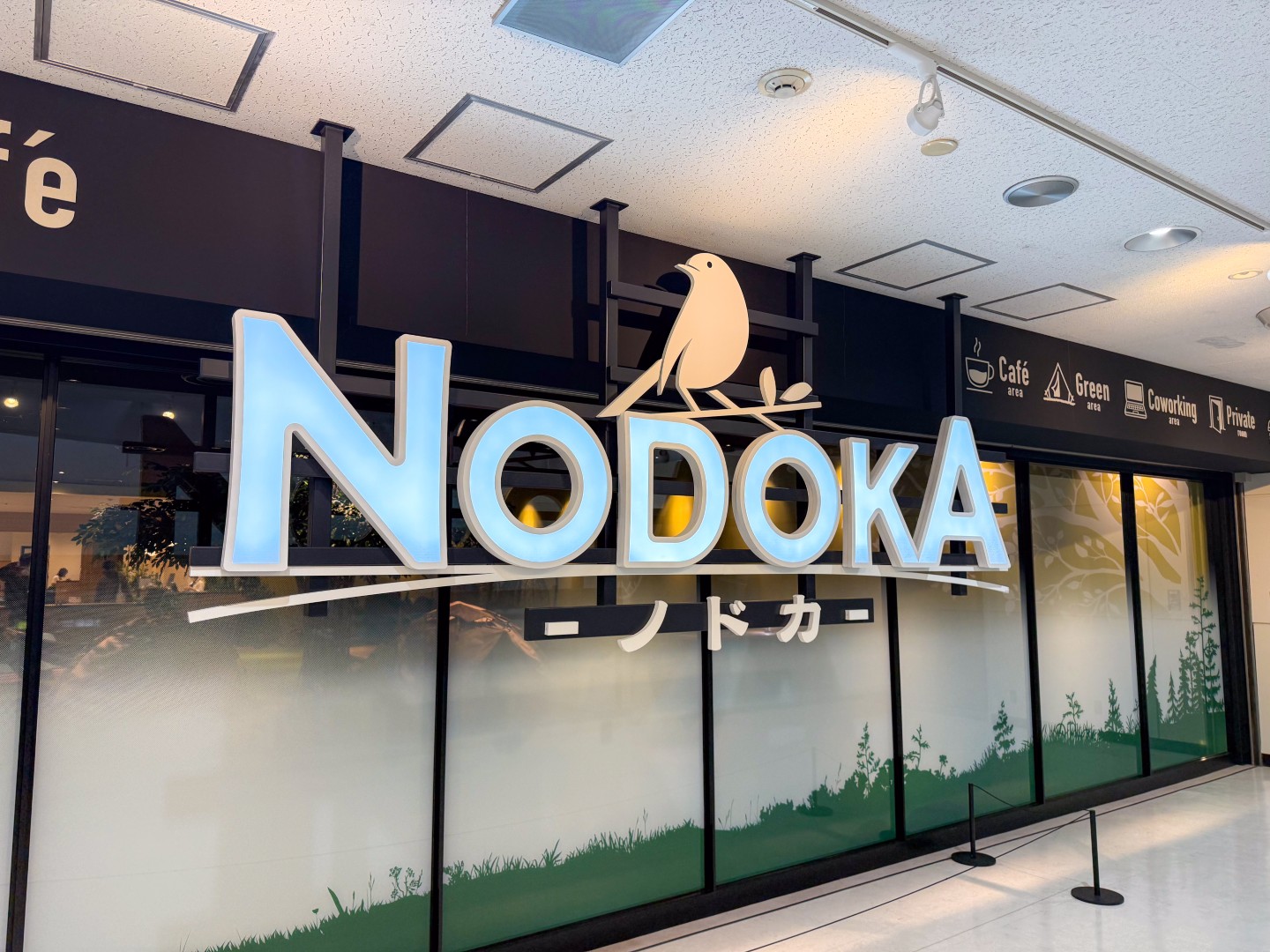 そんなとき、何もなさそうに見える2階に上がってください。吉野家の更に奥のほうへ進んでいくと……緑が広がったエリアとテントが見えてきます。ここはエアポートカフェNODOKA。2025年10月末にオープンした、カフェラウンジです。元は成田アニメデッキというアニメグッズショップがあったのですが、そこが新たな憩いの場所として生まれ変わりました。