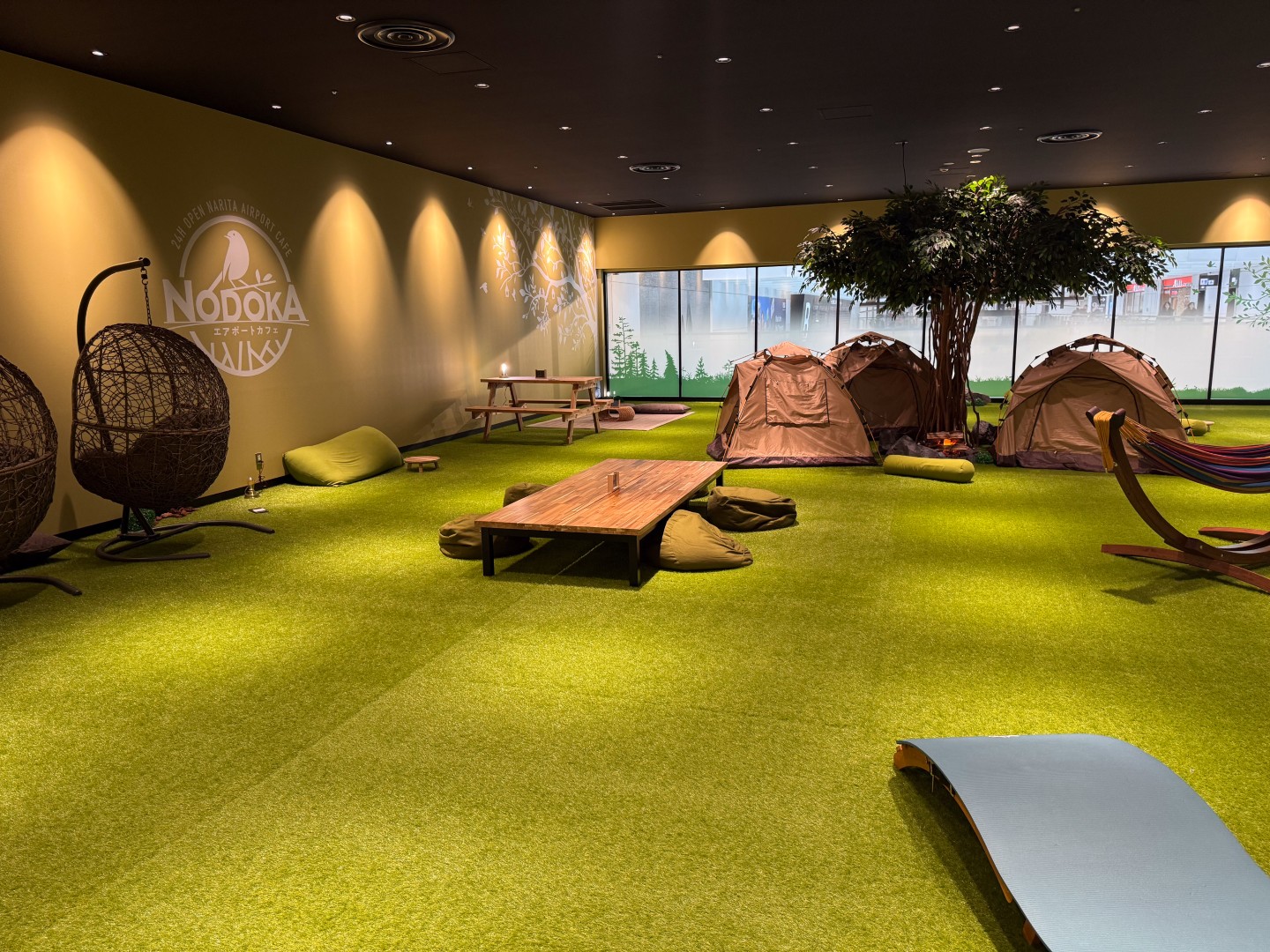 「エアポートカフェNODOKA」は、元々「成田アニメデッキ」があったスペースにできた施設なのですが、なんと広々とした空間に人口芝生やテントが置かれ、最高にチルできる施設になっていました。コワーキングスペースや、身体を休められる半個室やシャワーも完備されています。今回は、空港に現れたキャンプベースを紹介します。