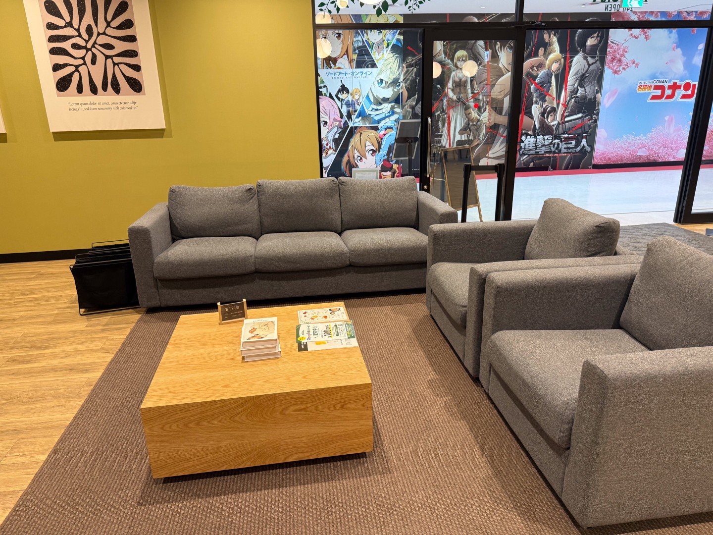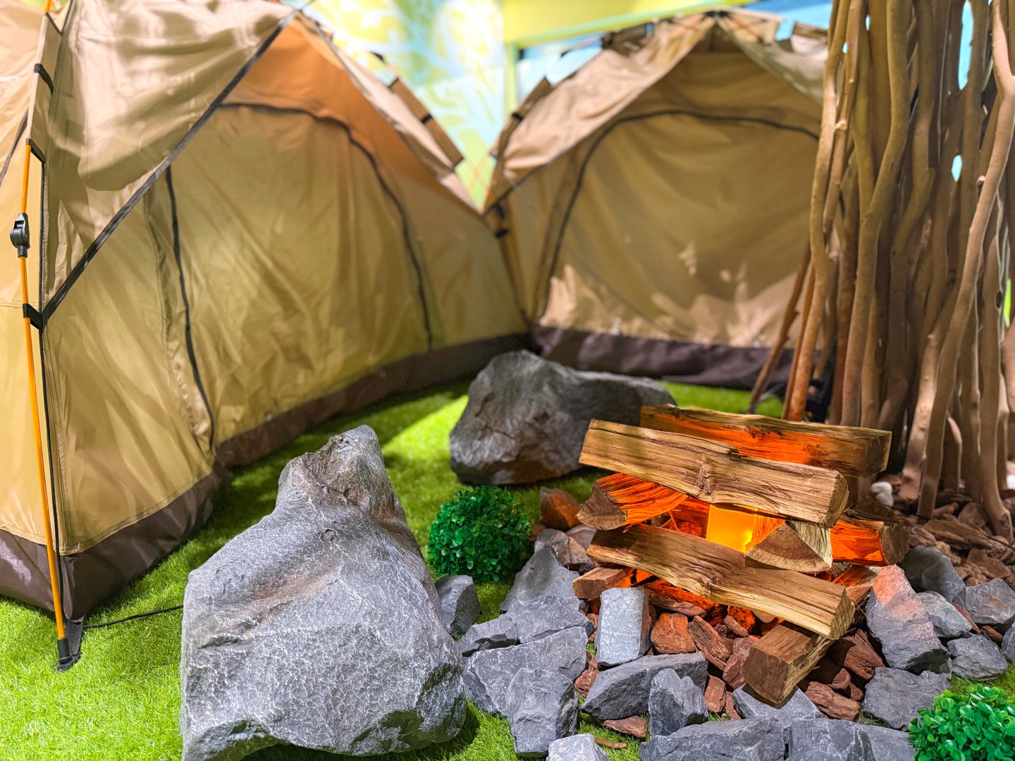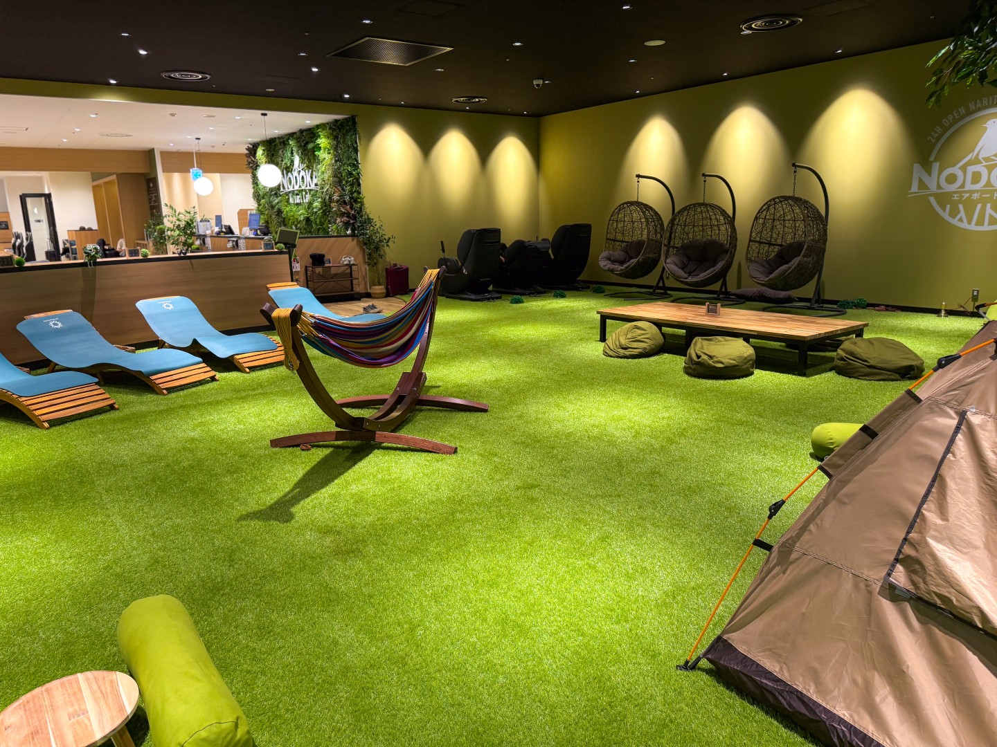 正面入り口から入ると受付があります。その右側には特徴的な芝生エリアが広がっています。まるでキャンプ場が現れたかのような癒しの空間。ウフロアには3つのテントが張られ、ウッドテーブルや、寝転んで休めるヨギボーが配置されています。さらに、木製のサンラウンジャーやマッサージ機も完備されており、緊張感を解きほぐし、靴を脱いでしっかりと足を休めることができます。