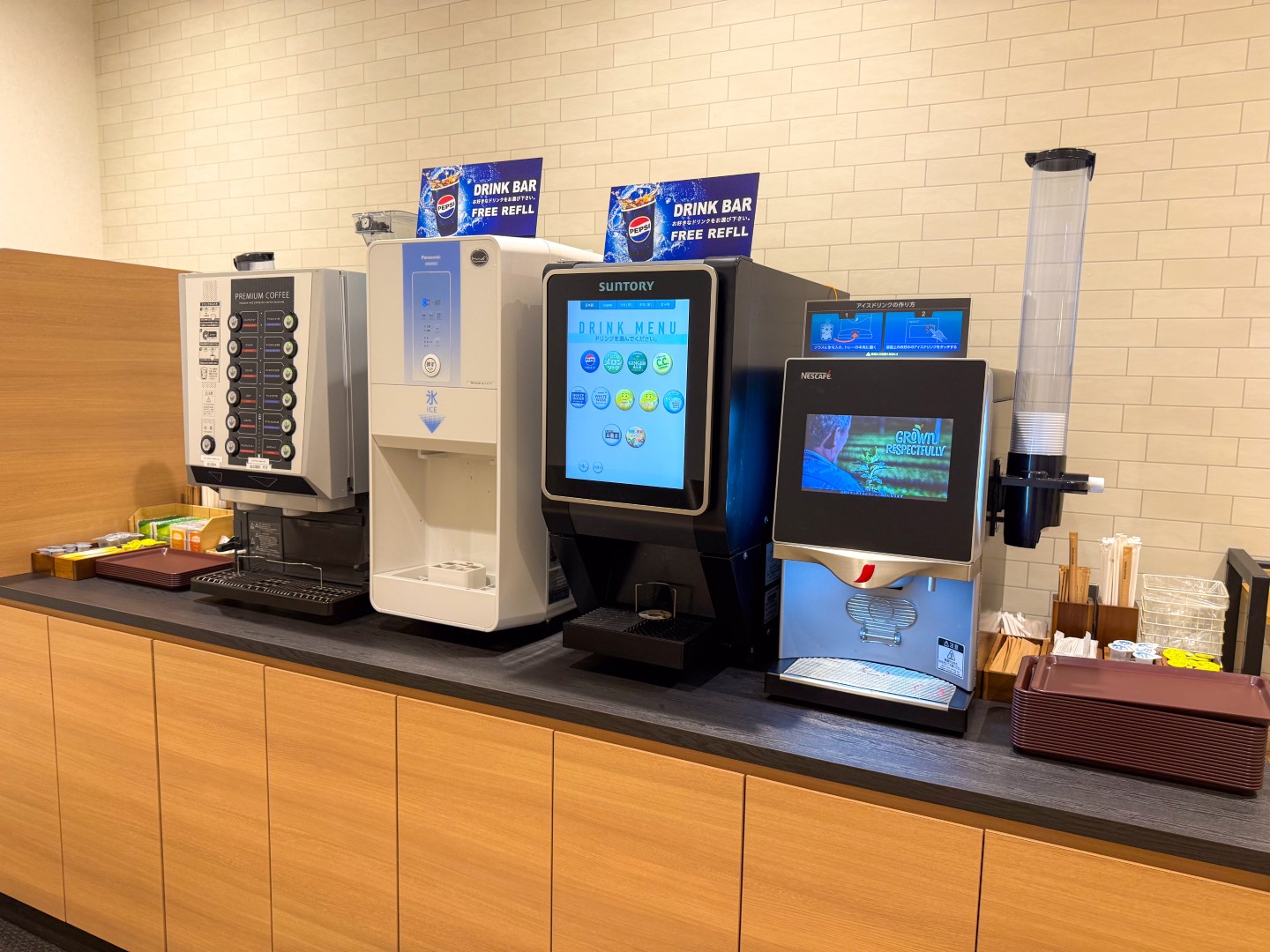 もちろんドリンクも揃っていて、ソフトドリンクやコーヒーを楽しめます。ドリンクコーナーの先には、旅する人にはありがたいシャワールームもあります。別料金1400円がかかりますが、フェイスタオルとアメニティが付いてくるのがありがたい。席を利用せず、シャワーだけを浴びることもできます。