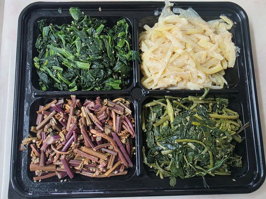 ホウレンソウやワラビ、シラヤマギク、キキョウの根の4種類のナムルが入ったナムルの盛り合わせと、