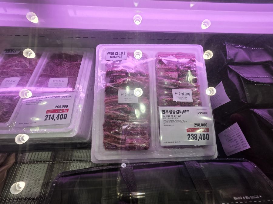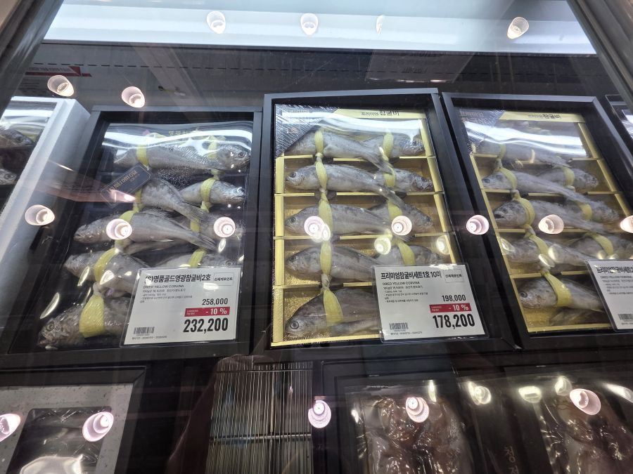 お膳料理に使用したりお土産にも喜ばれる韓牛カルビやクルビ(イシモチ)、ここ数年若い人たちにも注目されている薬菓も販売されています。