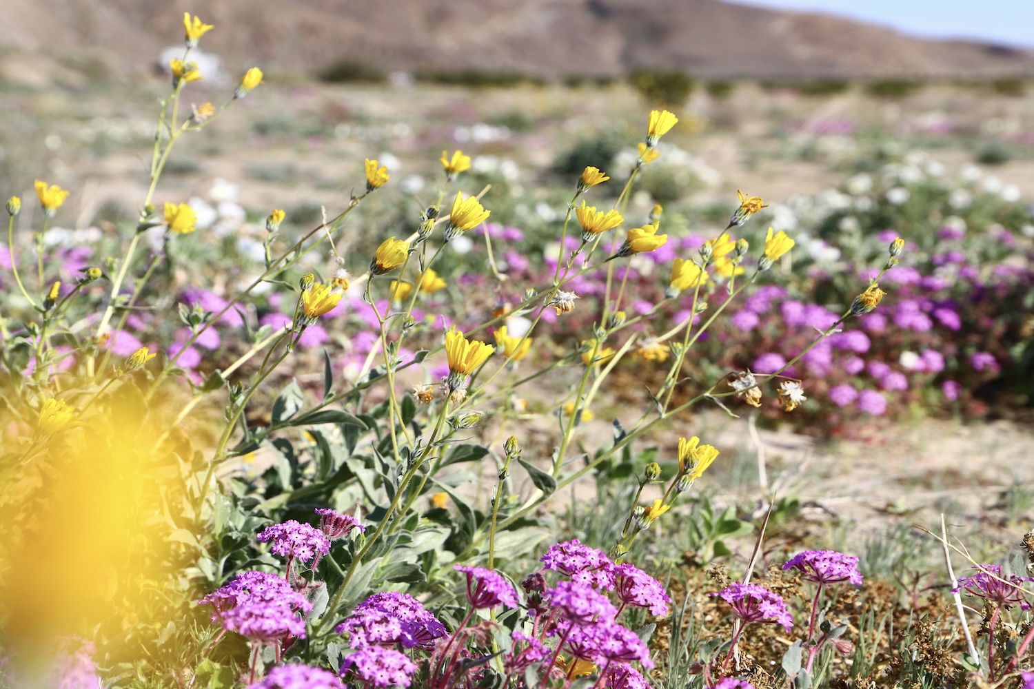 私が住んでいるサンディエゴから東へ車で約2時間。広大な砂漠が広がるアンザボレゴ砂漠州立公園(Anza-Borrego Desert State Park)は、冬に雨が降った年の春、一転して色彩に満ちた世界へと変わります。茶色一色で枯れた世界に200種類以上もの小さな花が灯る瞬間、砂漠は静かに息を吹き返すようです。