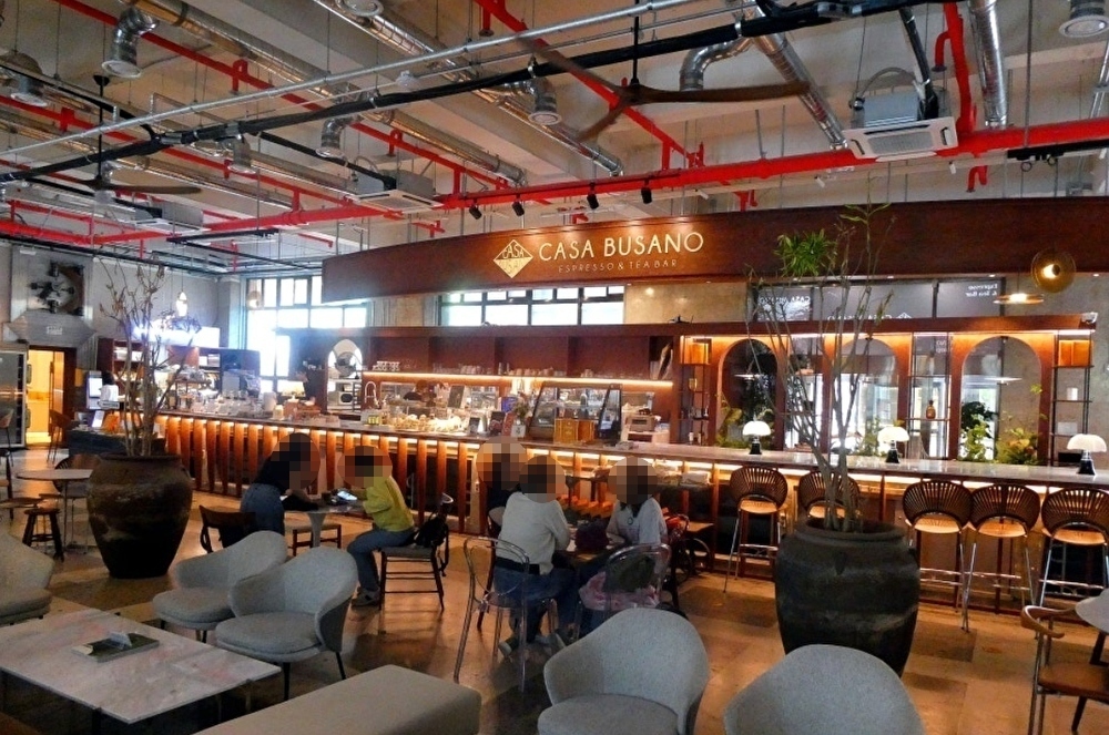 釜山近現代歴史館本館の中に入ると、1階の広い空間の右側にカフェ「CASA BUSANO」釜山近現代歴史館店の長いカウンターがあり、左側にはテーブル席が並んでいます。