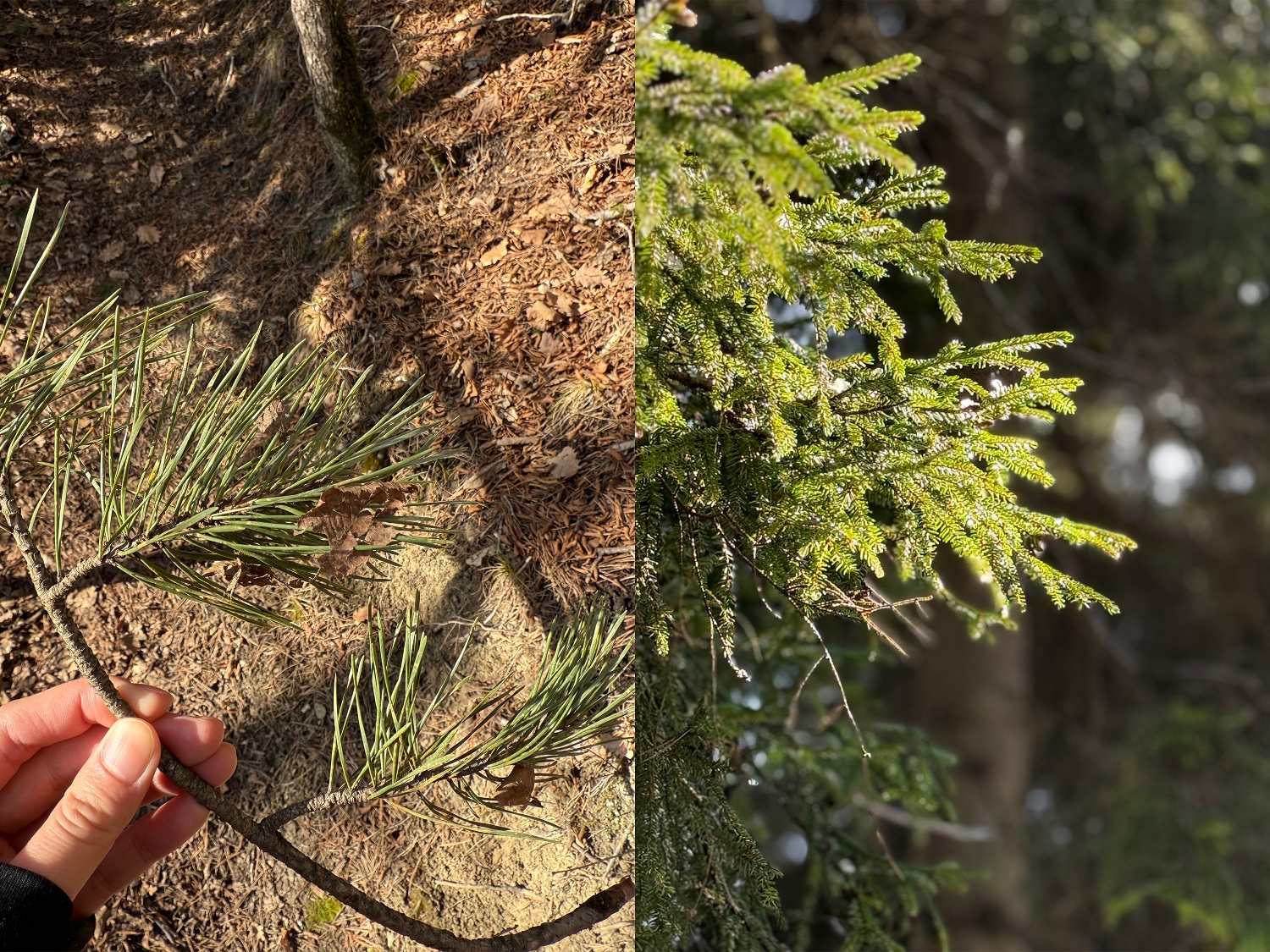 冬でも葉っぱを落とさない、常緑針葉樹の仲間たち。この森はほとんどが右のようなモミ属かトウヒ属の種と、左のようなマツ属の種で構成されていました。日本で見られるものと見た目はとてもよく似ていますが、種は異なると思います。