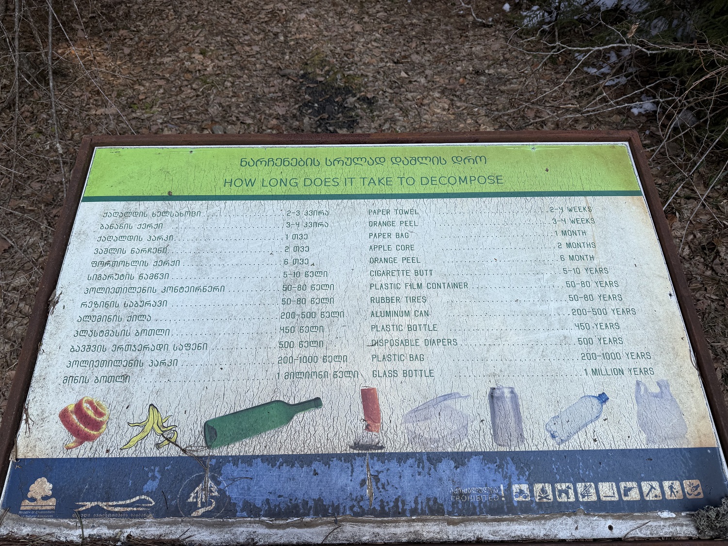 人間がゴミとして捨てたものが、自然に還るまでどれくらいの時間がかかるだろう? というのを示したものです。みなさんは、紙やペットボトル、缶やビンがどれくらいで自然に還るかご存知ですか? 想像以上に長い時間がかかるのです。ハイキング中にこのパネルを目にとめた人が、今一度ゴミについて考え、ポイ捨てをやめる一助になるといいなぁと思いました。