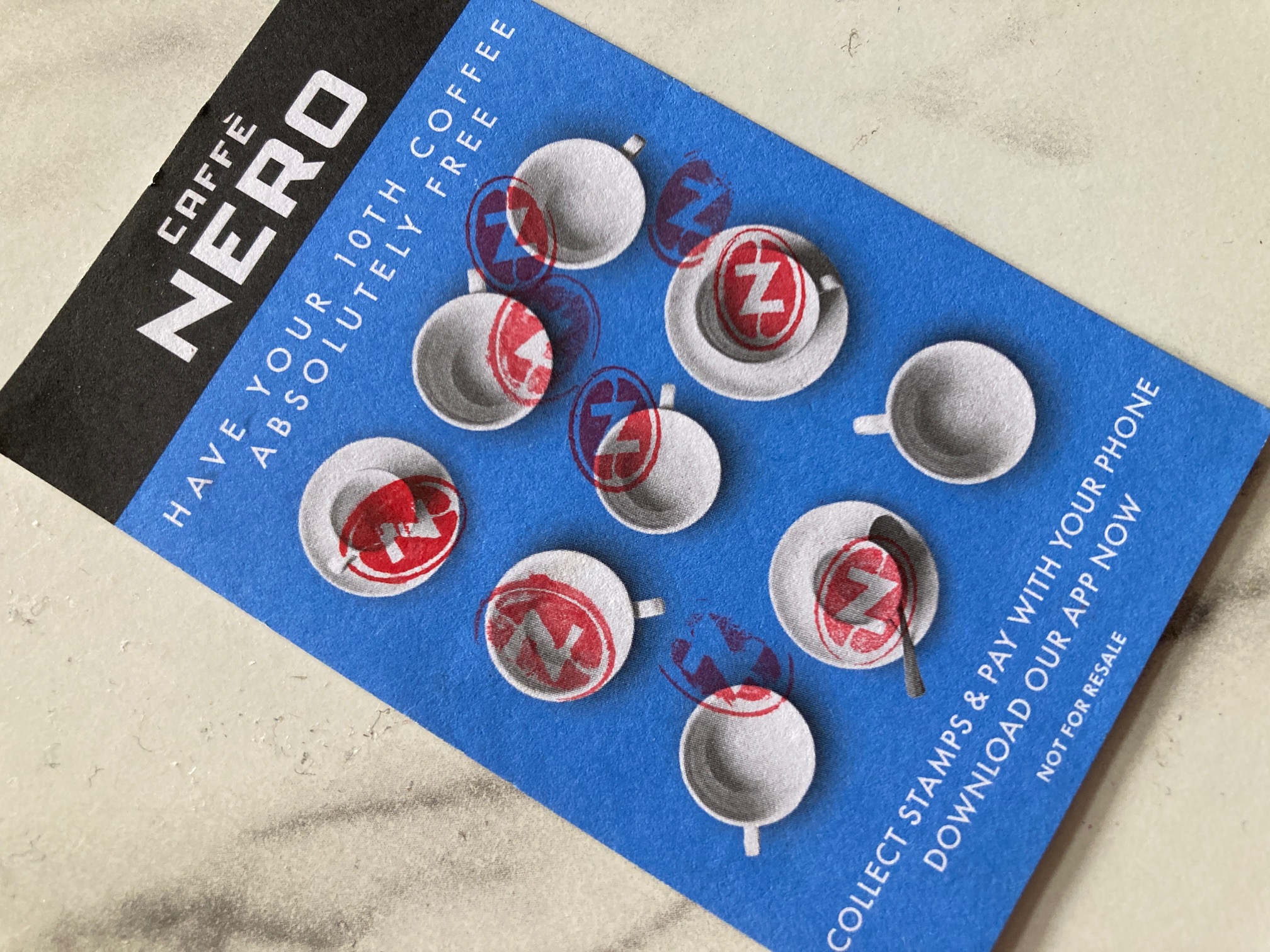 もし中・長期の滞在ならば、9杯分のスタンプが溜まると次の1杯は無料になるスタンプカードもどうぞ。有効期限がないので、時々イギリスに来る人にもおススメですよ!