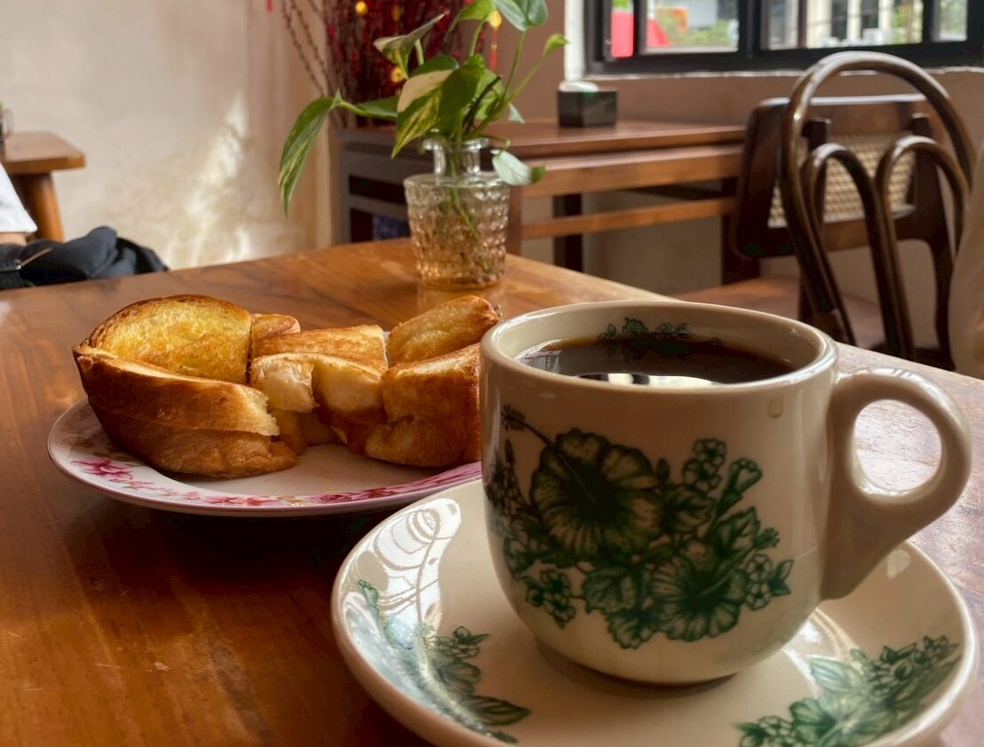 コーヒーのお供に選んだのは、カヤトーストとふわっとしたパオ(小麦粉生地で具材を包んで蒸した食べ物)。バターとカヤジャムがとろりと溶けるトーストは、どこか懐かしくてやさしい甘さ。あたたかいパオをちぎりながら、ゆっくりコーヒーを飲む時間もまた、贅沢です。