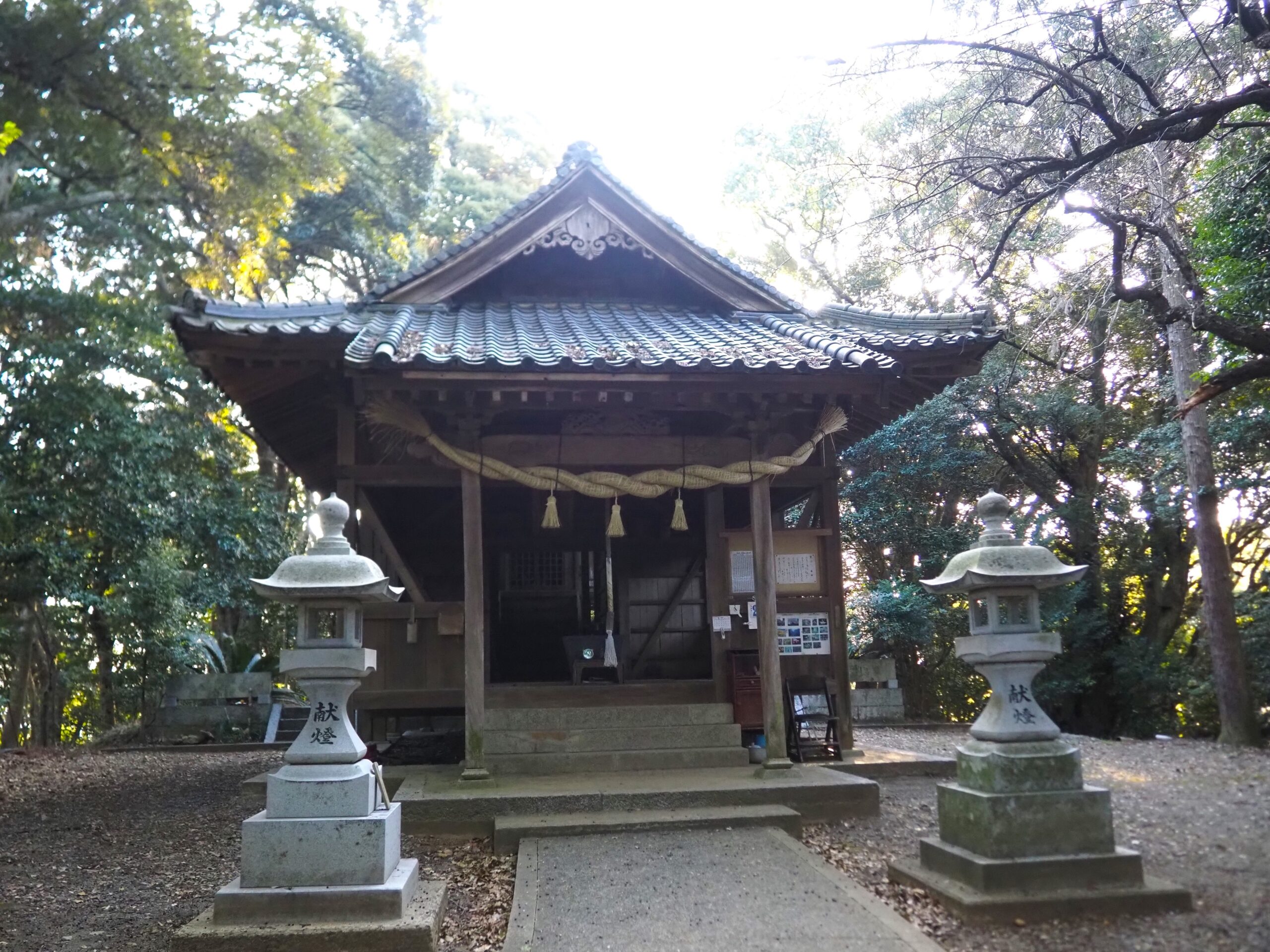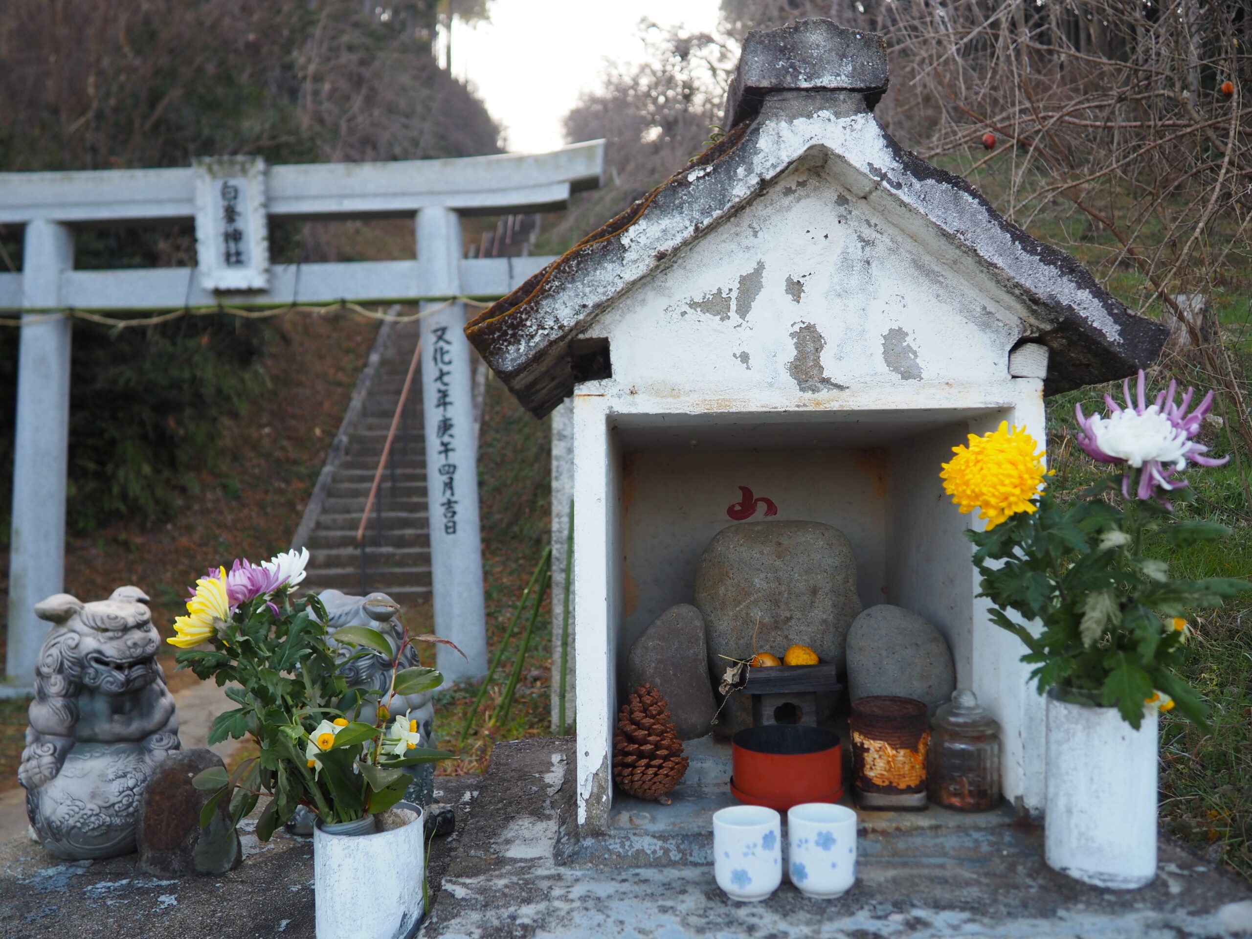 JR九州鹿児島本線「海老津駅」から歩いて5分ほどで神社に到着します。近所の方のなかには「階段神社」と呼ばれる方もいるそうです。鳥居には「白峯神社」と額がかかっており、右側には祠と狛犬がちょこんと置かれていました。お花や松ぼっくりが供えられ、地元の方々がよく管理をされている印象を受けます。