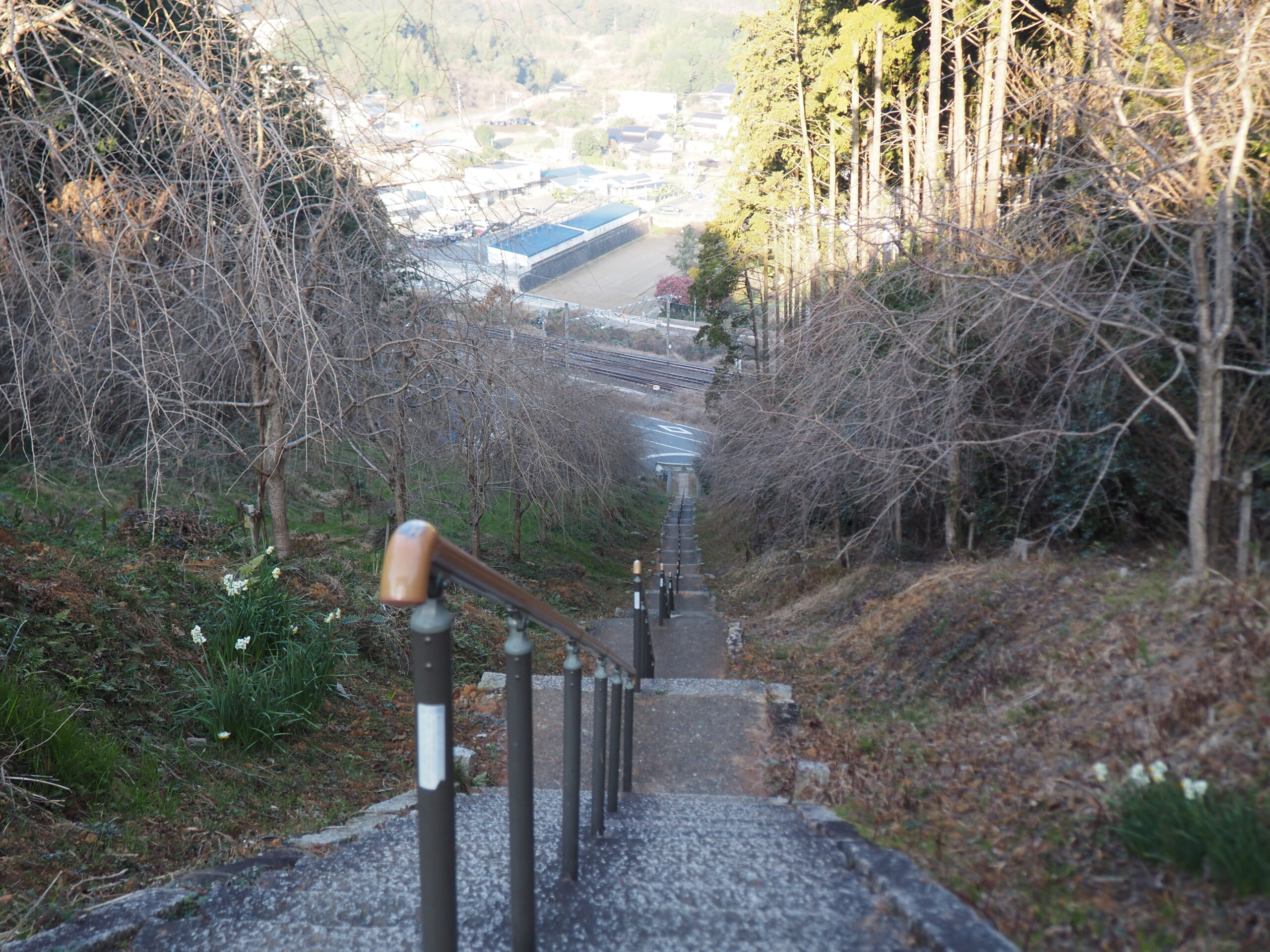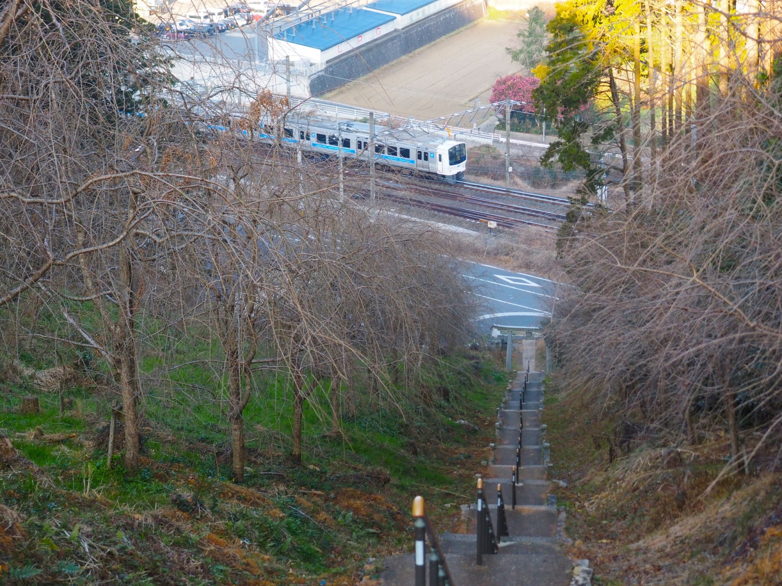 息を整えて気持ちを落ち着かせて、また登っていきます。途中、後ろを振り返ってどれくらい登ったのか見てみると、意外と高くまで登っていました。角度もあるので、冬季オリンピックのスキージャンパーのような気持ちにもなります。タイミングよく電車も通ったので、思わぬ撮影ポイントとなって、鉄道好きにはうれしい発見でした。