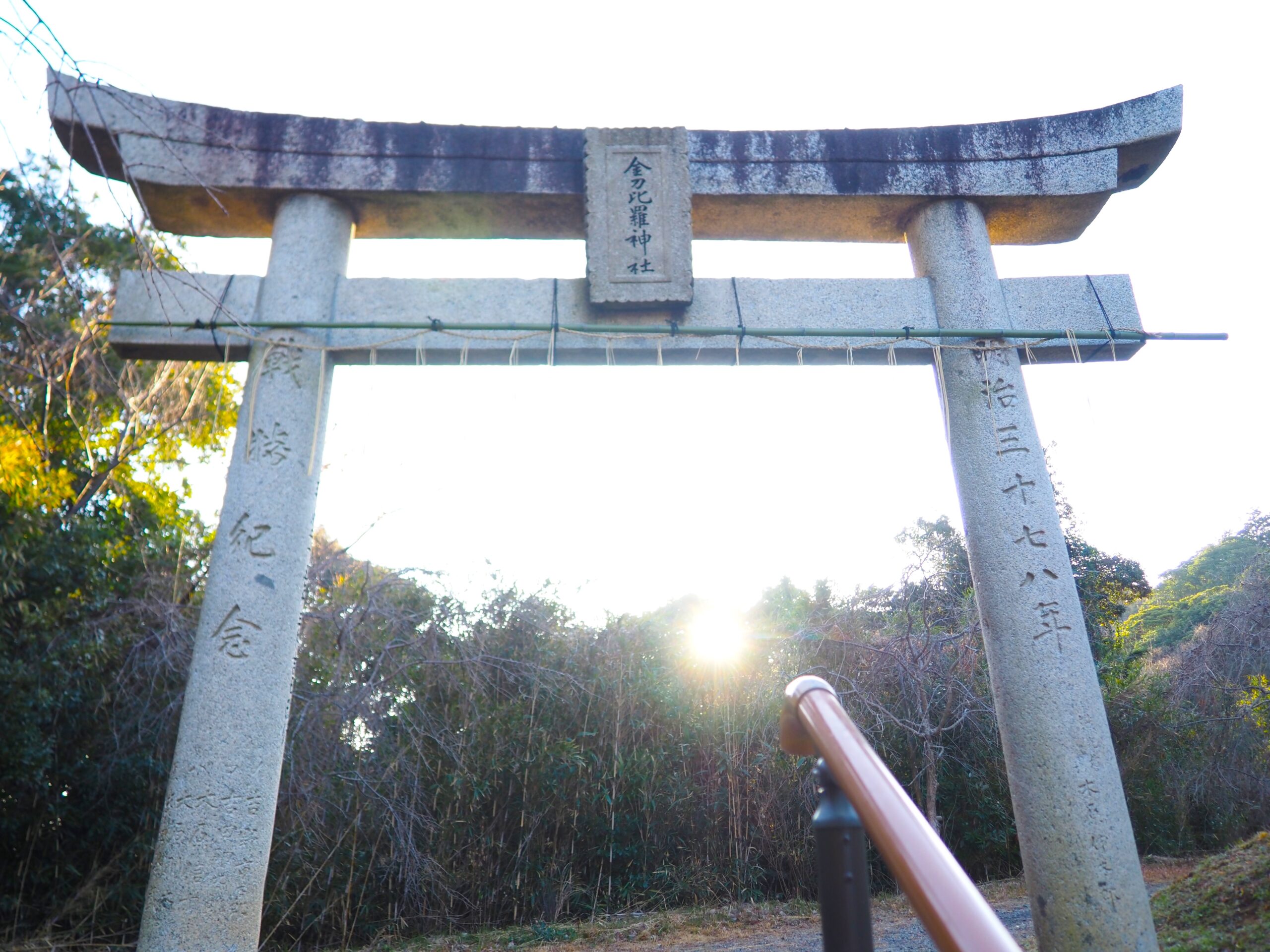 頂上までたどり着くと、金刀比羅神社の鳥居が現れ、そこでゴールかと思いきや舗装された参道がまだまだ先に続きます。なんで金刀比羅神社? と思いきや、どうやら金毘羅山にあるからと思われます。看板によると岡垣町町制50周年時に、「金比羅山を千本の桜の咲く山へ」という願いから、参道の両側に八重紅枝垂桜60本、横浜緋桜11本の苗木が植林されたそうです。