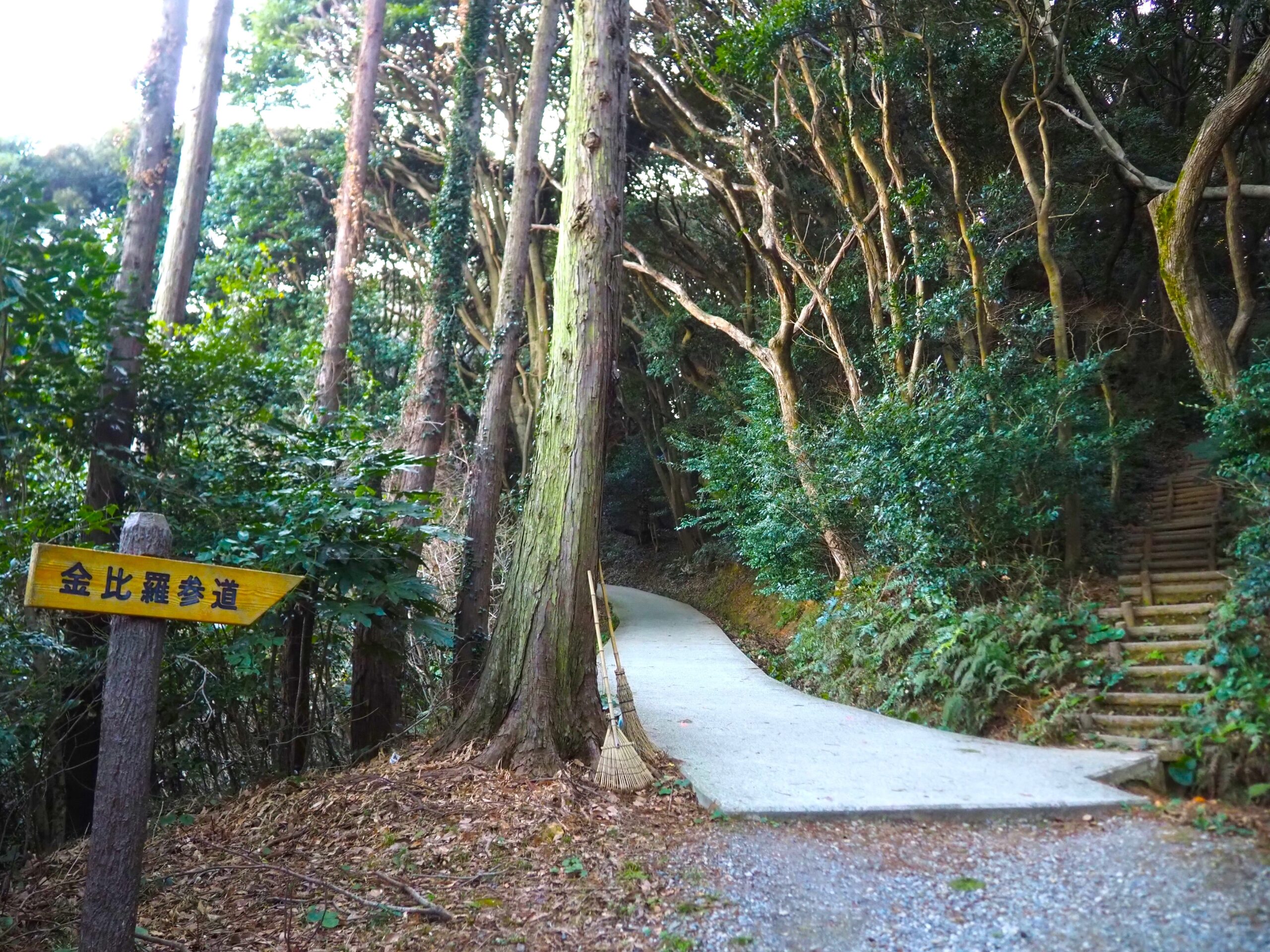 道が舗装されずいぶん歩きやすく、ずんずん進んでいくと、金比羅参道への案内板とさらにその先に階段が続いていました。心臓破りの階段はまだまだ続きます。