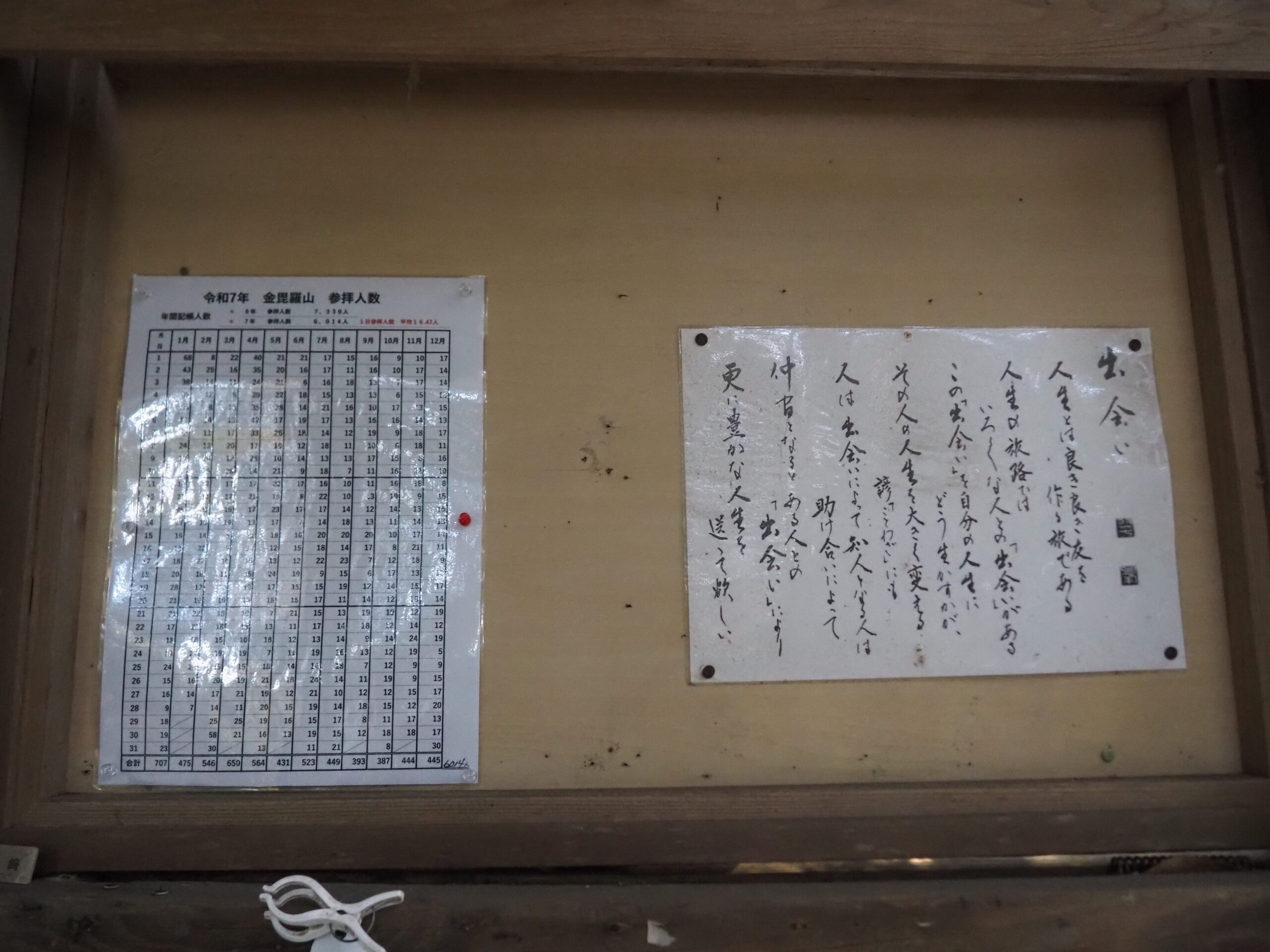 参拝を済ませてぐるりと見渡してみると、掲示板には金比羅山の参拝者数が記録されていました。令和6年7320人、令和7年は6014人が参拝しており、昨年の1日参拝平均は16.47人でした。