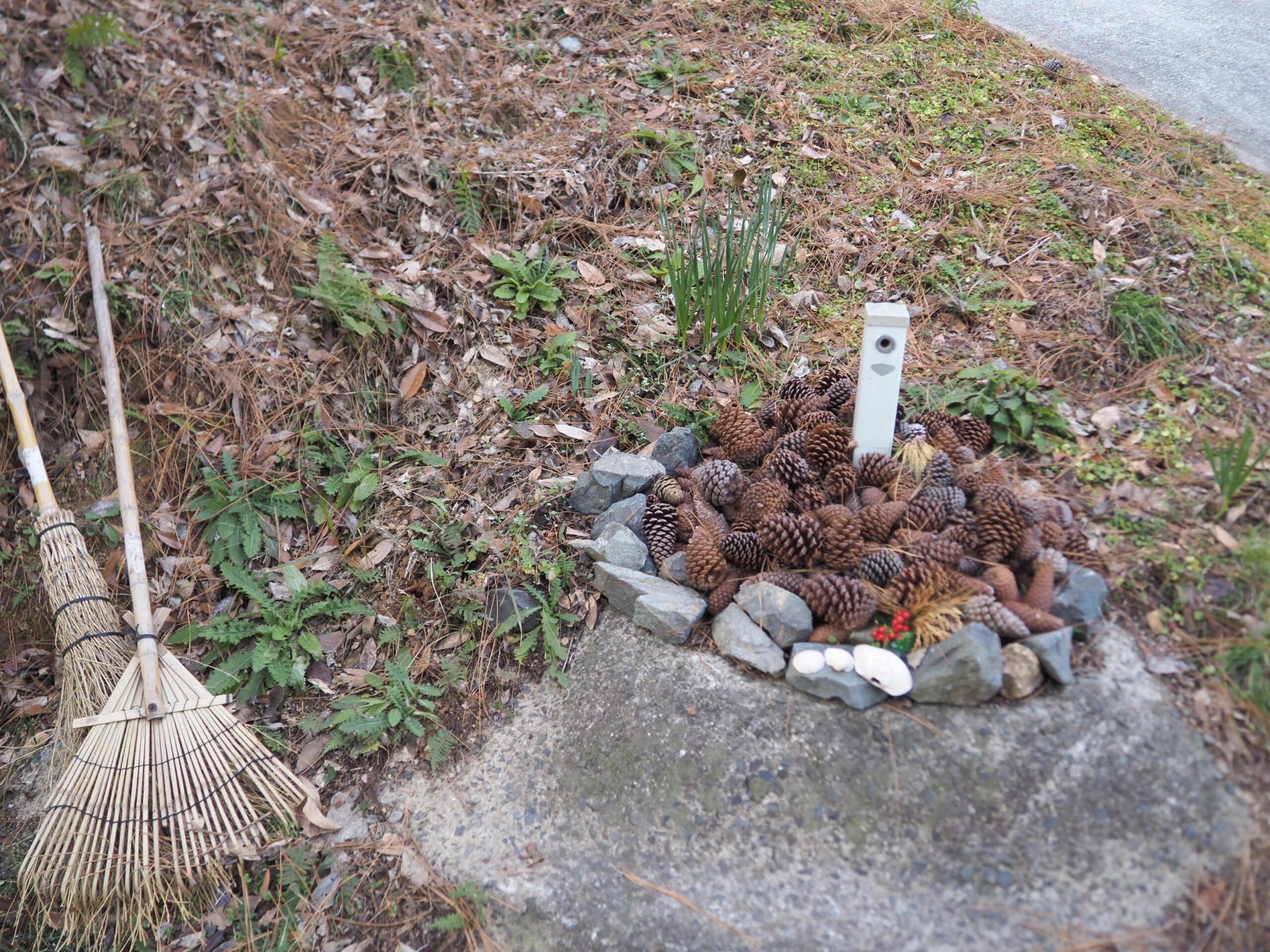 参拝が終わり、来た道へ引き返します。途中には地元の方々だろうか、熊手と松ぼっくりが集められ、参拝しに来た方の心を和ますような心遣いがうれしかったです。