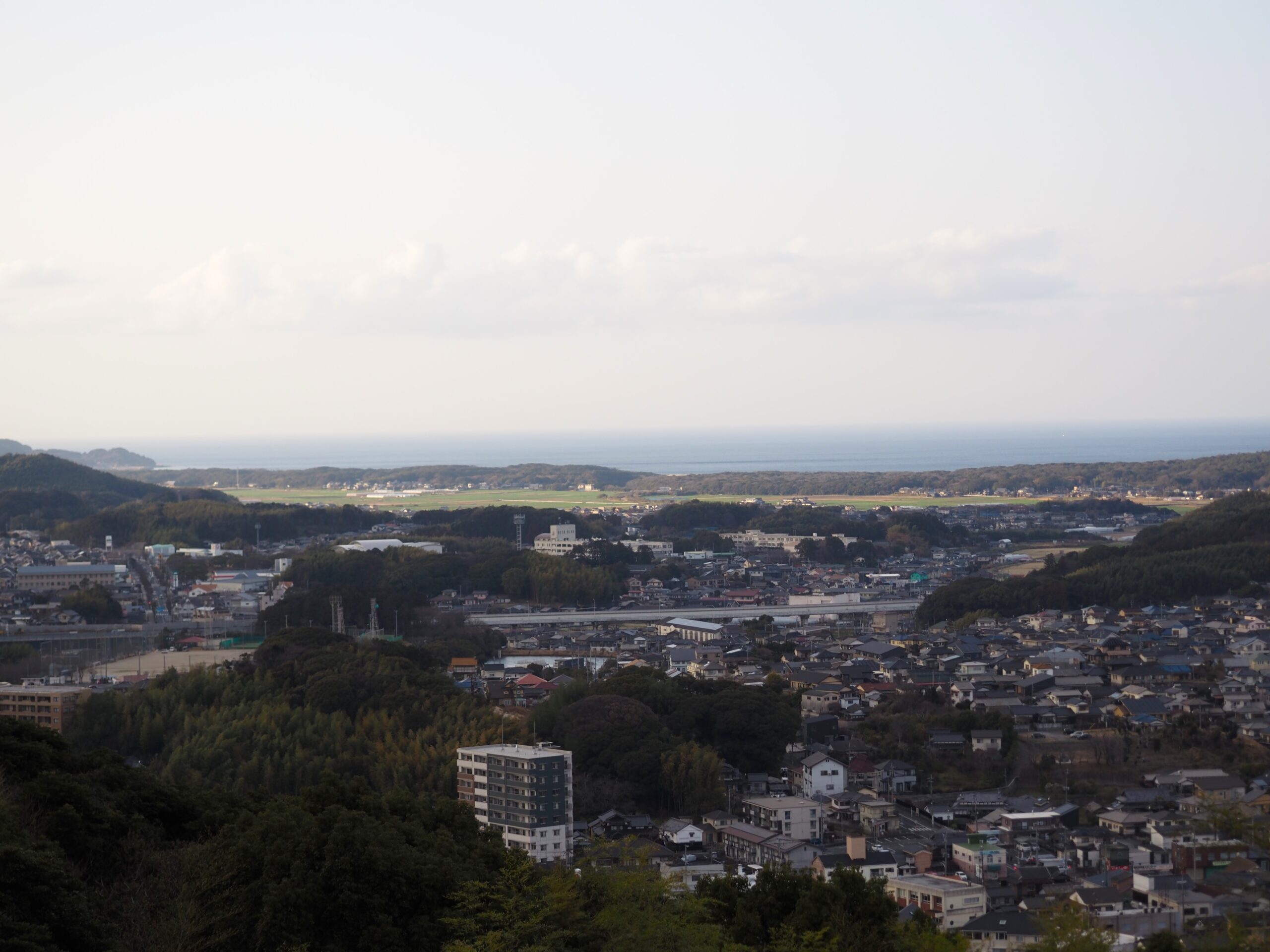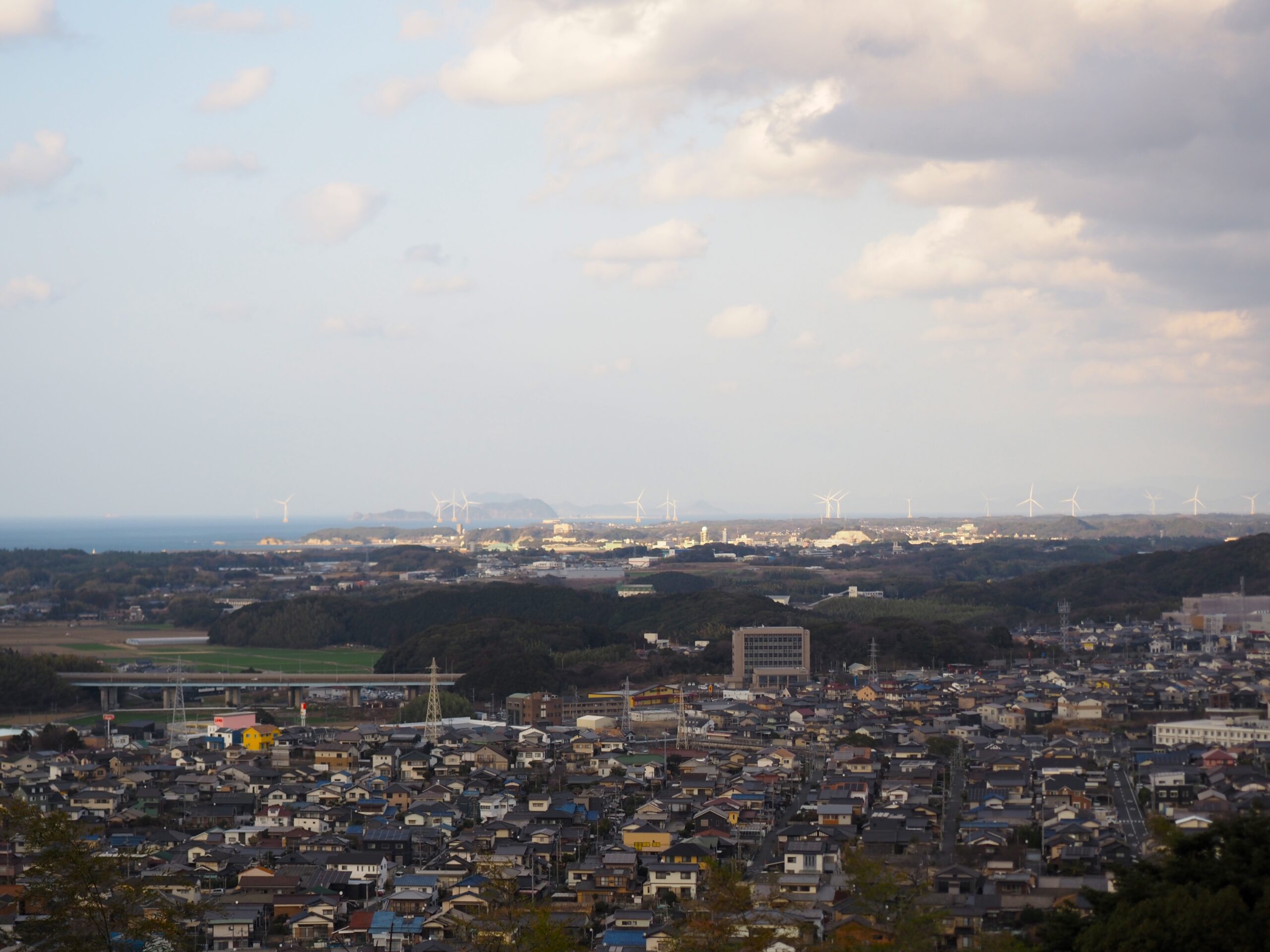 そして見晴らしの丘からの眺めは、その名の通り見晴らしが良かったです。自分が巨人になって地図を見下ろす感じで国道3号線が通っていることを確認でき、若松区の「北九州響灘洋上ウインドファーム」の巨大な風車群や、三里松原とよばれる12kmにもおよぶ防風林も確認できました。天気の良い日は沖ノ島も見えるそうですが、残念ながら今回は確認できませんでした。