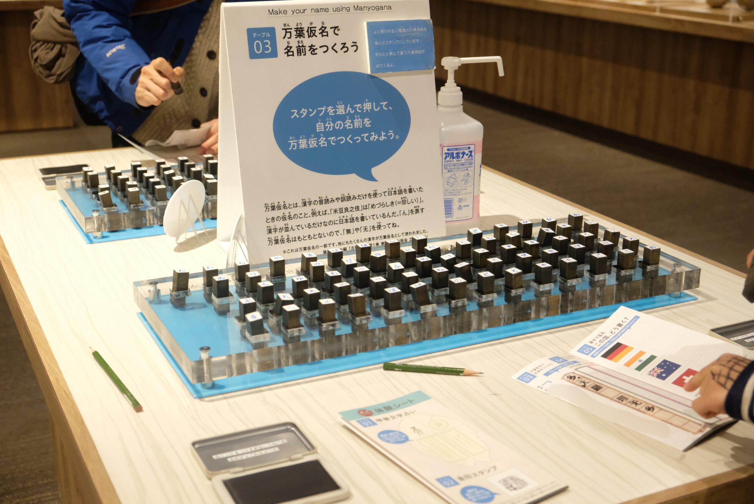 また、万葉仮名スタンプで自分の名前を押すコーナーも。万葉仮名とは、漢字の意味ではなく、音だけを借りて日本語を書いた、古代の表記方法のこと。