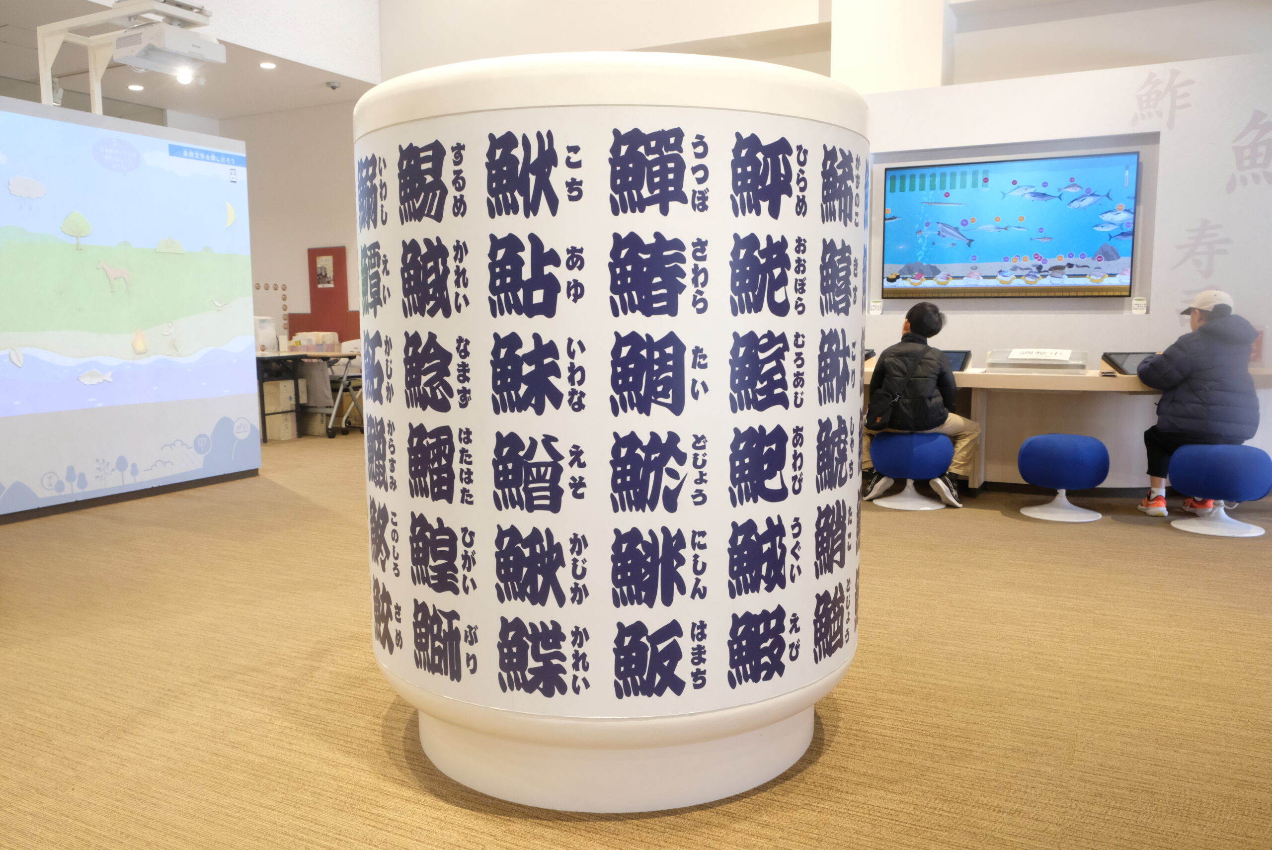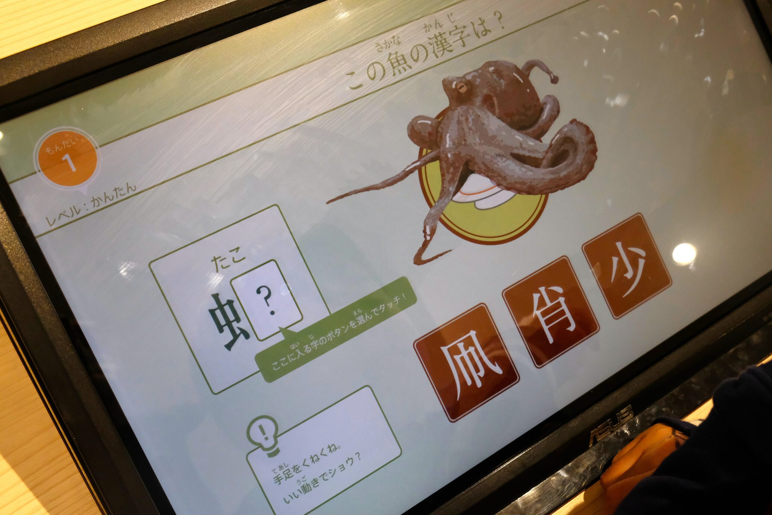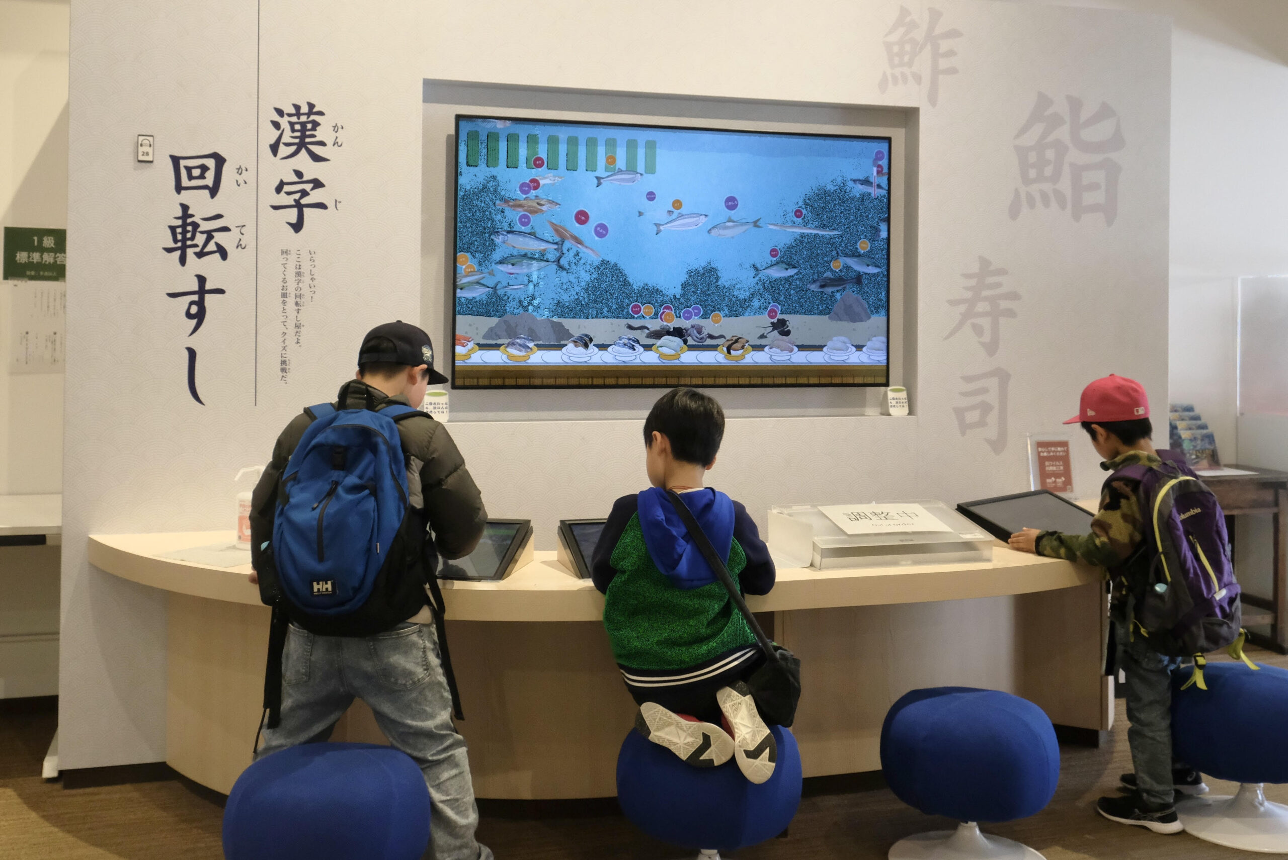 回ってくるすしを取ると魚へんの漢字クイズが出題される「漢字回転すし」は、思わず大人も悩んでしまう難しい漢字が次々に登場。