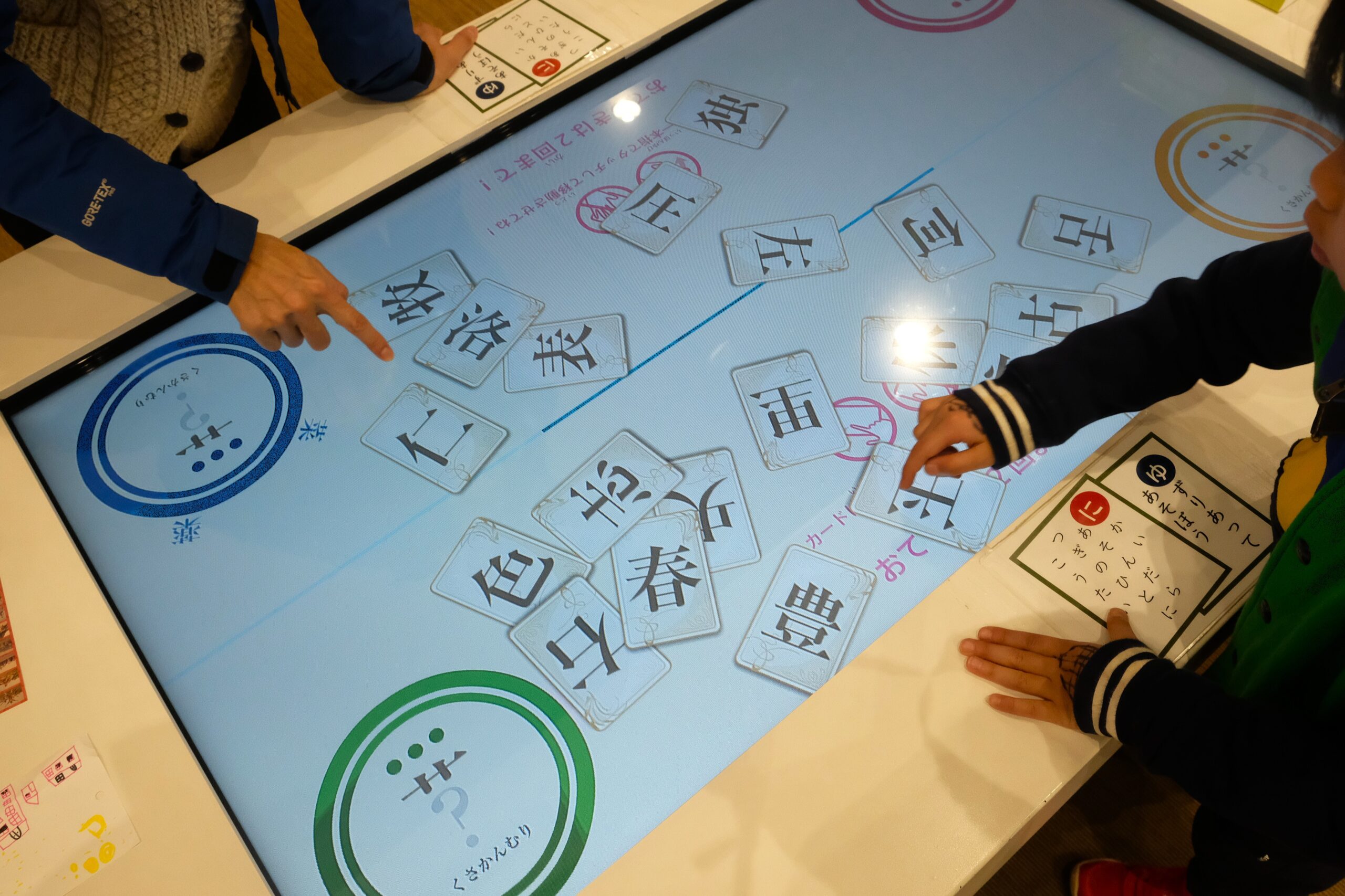 お題の部首と場にあるカードを組み合わせて正しい漢字を完成させる「タッチパネル式かるた」は、4人まで対戦可能。子どもだけでなく、大人もつい夢中になってしまいます。