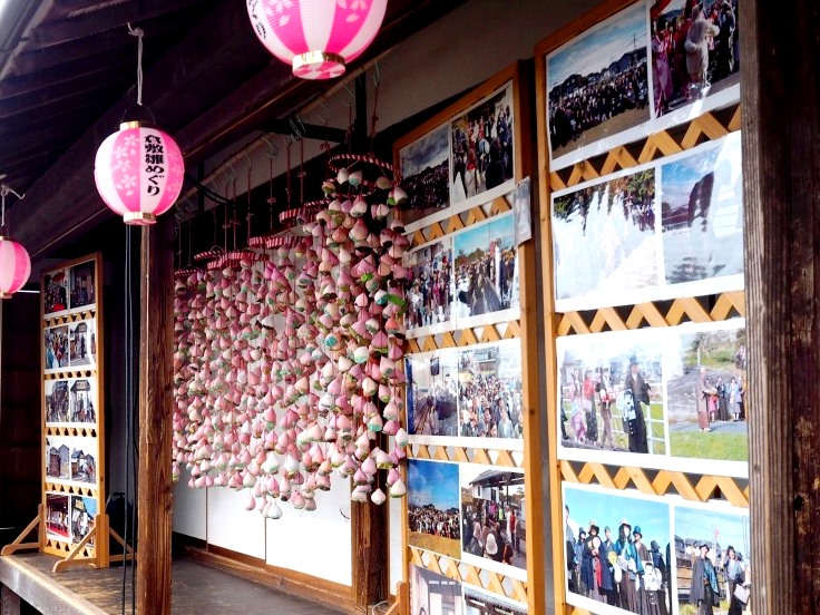 縁側には多くの吊るし雛と横溝正史の小説の登場人物に扮して歩く「1000人の金田一耕助」というコスプレイベントの写真が貼りだしています。毎年秋に開催されているイベントで、清音駅をスタートして約5km歩き、真備ふるさと歴史館で解散となります。