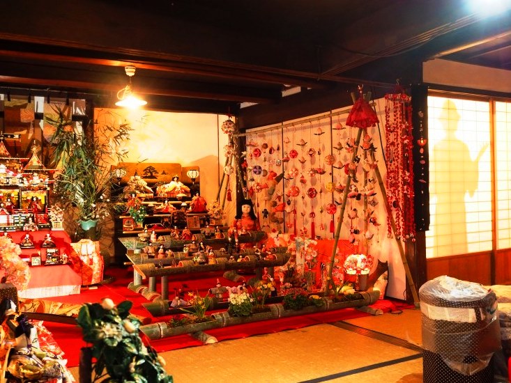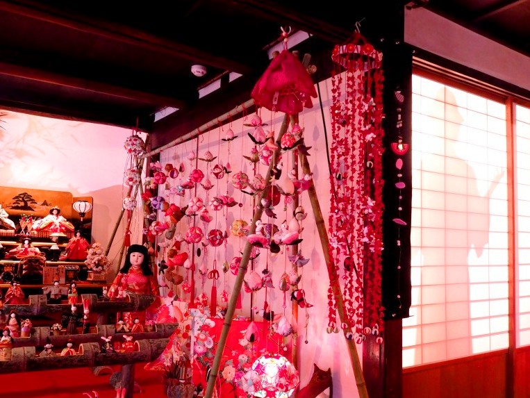 普段は横溝正史の着物や机などが置かれている部屋も雛段と吊るし雛一色で飾り立てられ、素朴ながらも晴れやかな雰囲気です。奥の部屋の金田一耕助のシルエットが浮かんでいるのも見どころですよ。