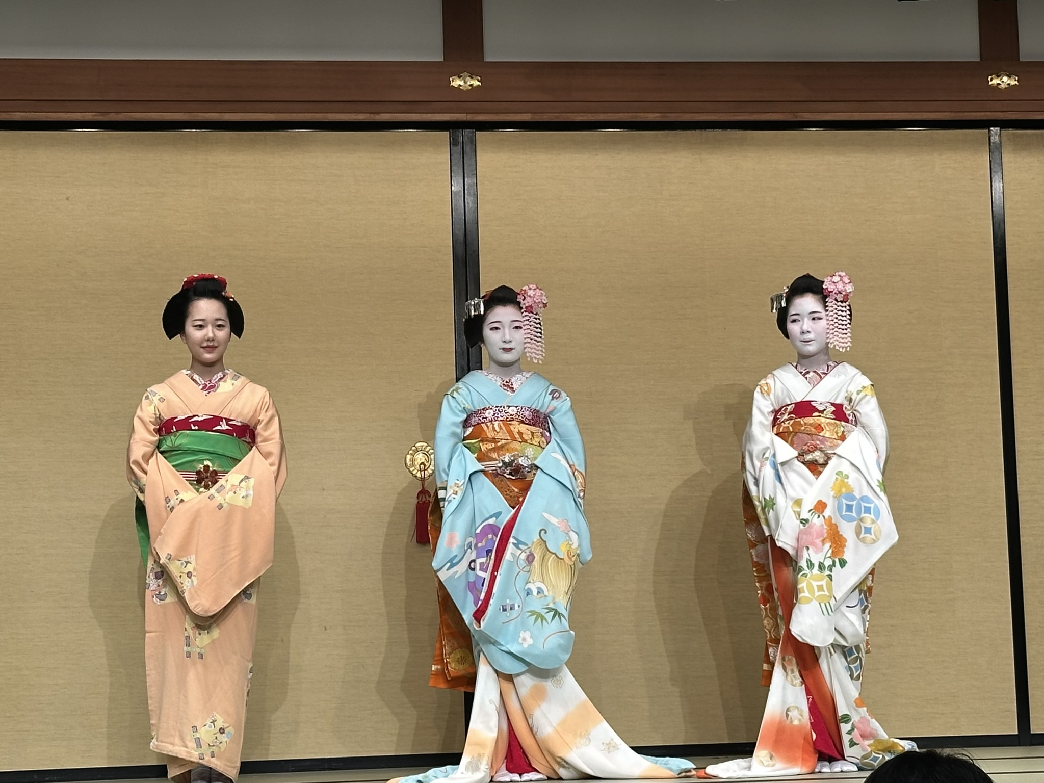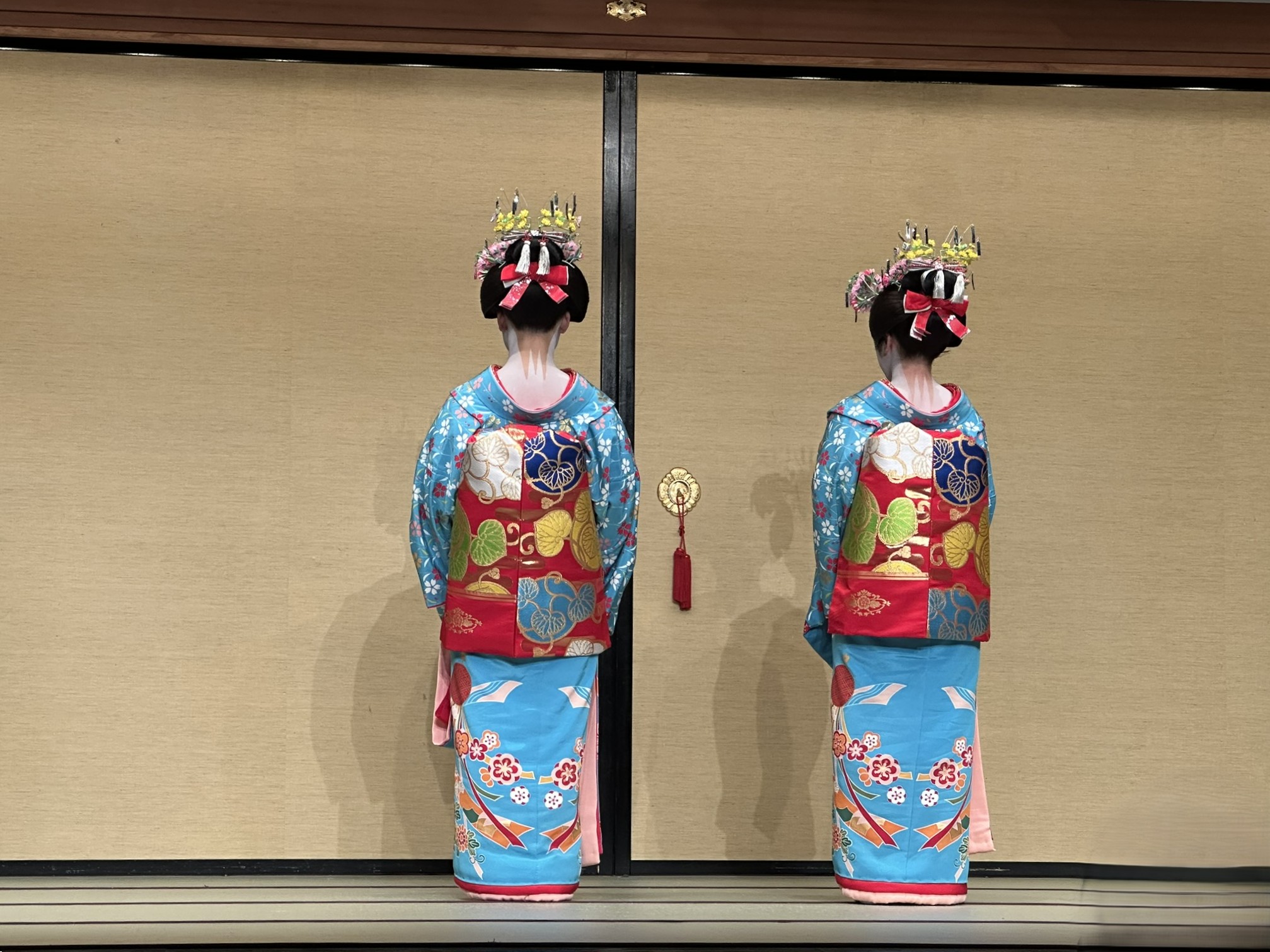 発表後、劇場内ではプログラム用の写真撮影や衣裳合わせも行われました。舞妓や芸妓の所作は自然で美しく、間近で見ると日々の稽古の積み重ねが伝わってきます。