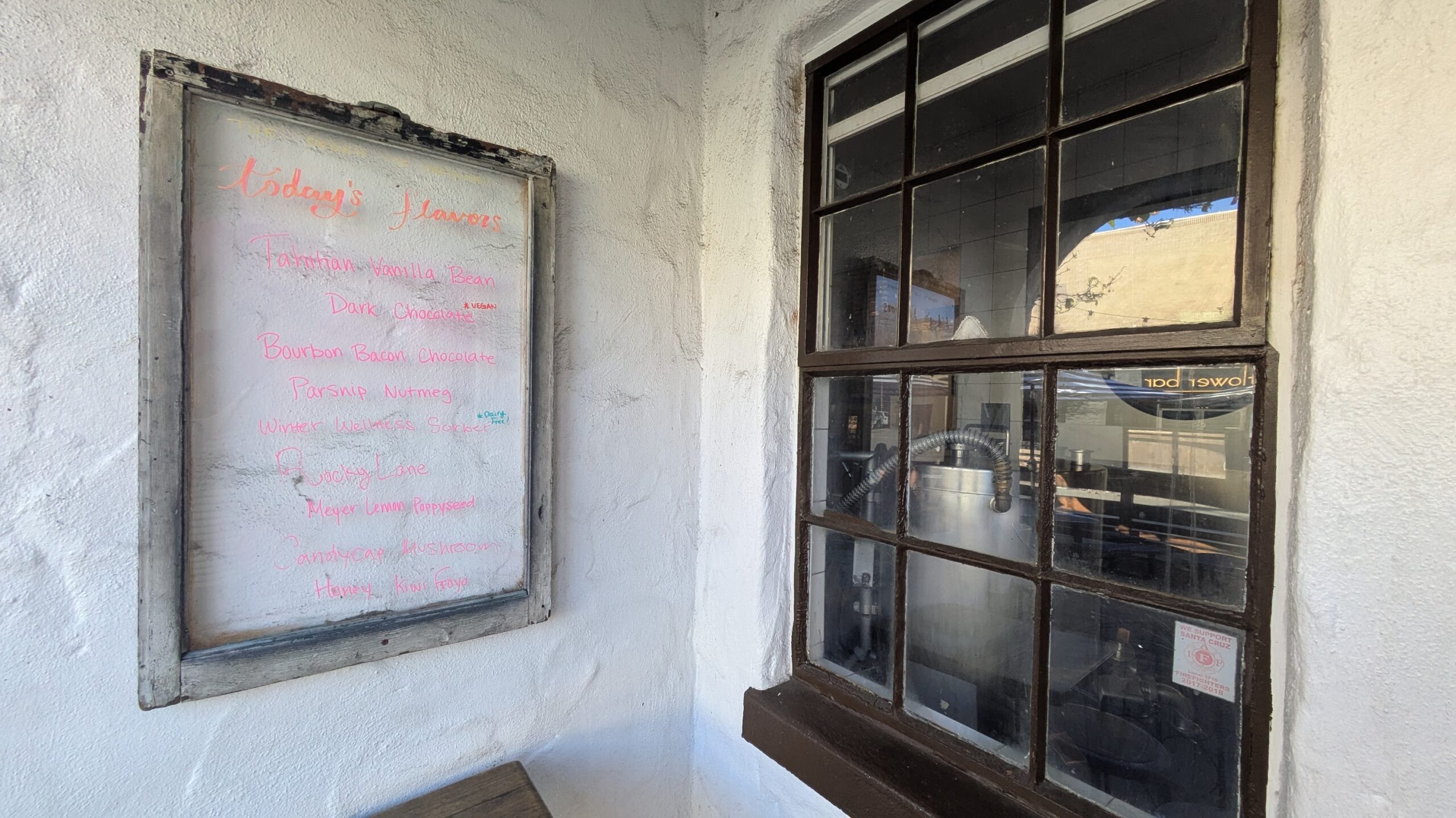 キッチンの見える化:店内にはガラス張りの製造ルームがあり、実際にアイスクリームが作られている様子を間近で見ることができます。「地元の恵みを丁寧に加工する」という、サンタクルーズの食文化を象徴する光景です。