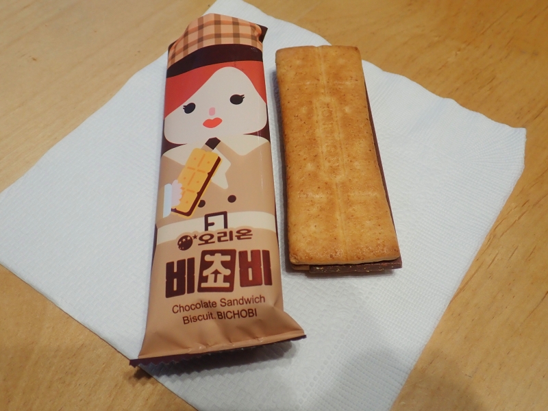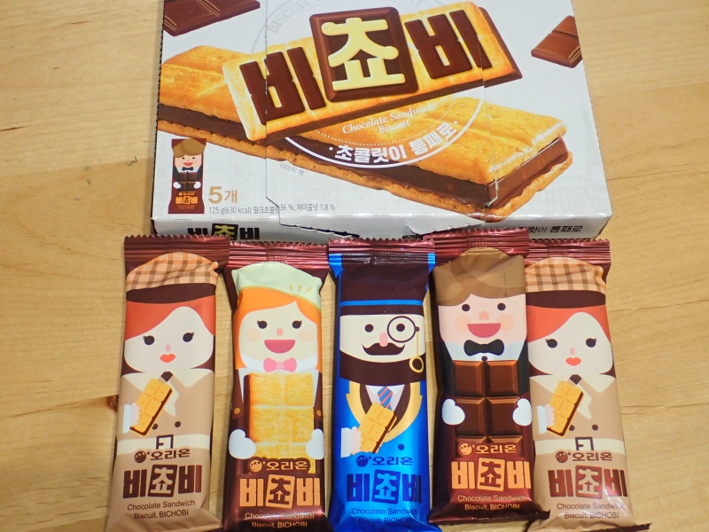 パッケージがかわいく、バラまきお菓子としても人気のビチョビ(비쵸비)は大型スーパーやコンビニなどで購入できます。写真はオリジナルのパッケージですが、観光地などでは韓国伝統パッケージのビチョビが販売されています。チョコレートを挟んだビスケットで食べやすくおいしいです。