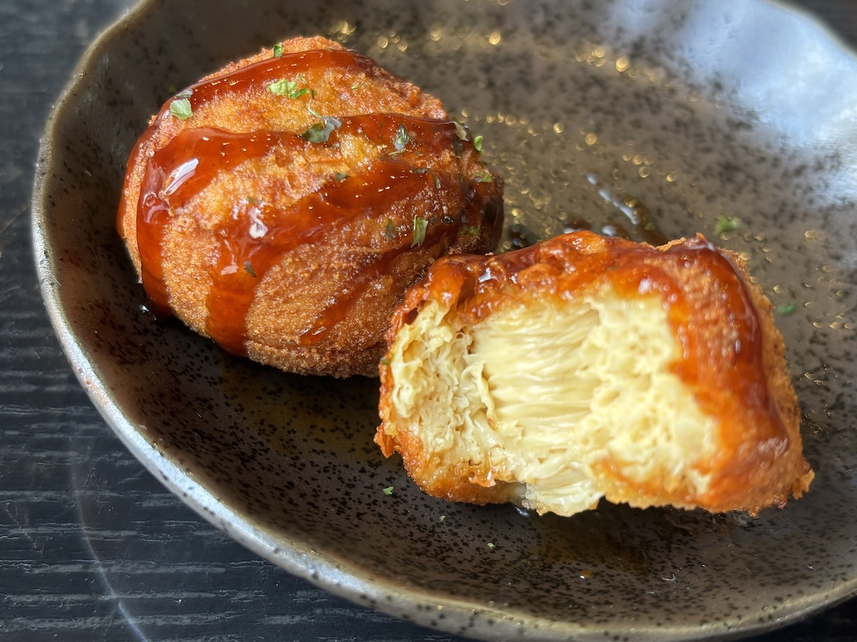 サイドメニューの日光名物の湯葉を使った“ゆばの唐揚げ”は、オリジナルソースでいただきます。外はカリカリ、中がふわっとした食感で、これが意外と美味しい。2人で3個/皿を注文しましたが、最後1個は取り合いになったほど。是非、お試し下さい。