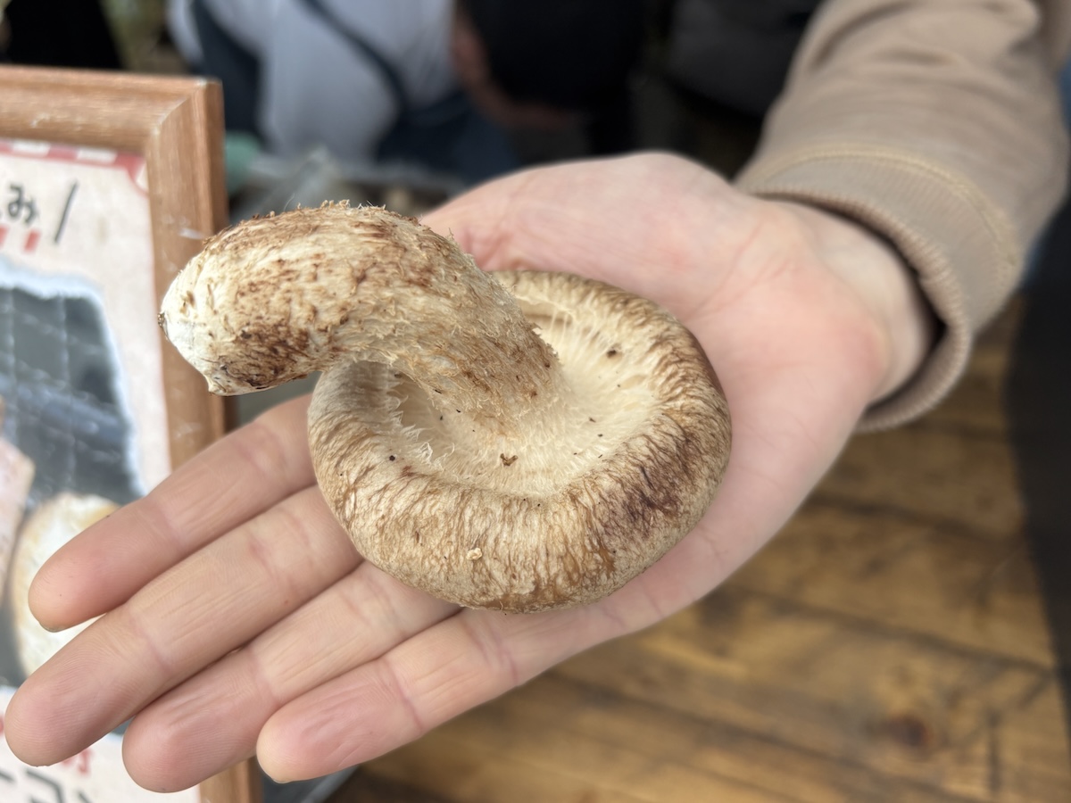 その中で私が気になったのが、水を一滴も使わずに育てたという“極上しいたけ”のあいされしいたけさんのお店。店員さんに普通のしいたけと何が違うのか、聞いてみたところ、手のひらが隠れてしまうほどの巨大しいたけを出して見せてくれました。