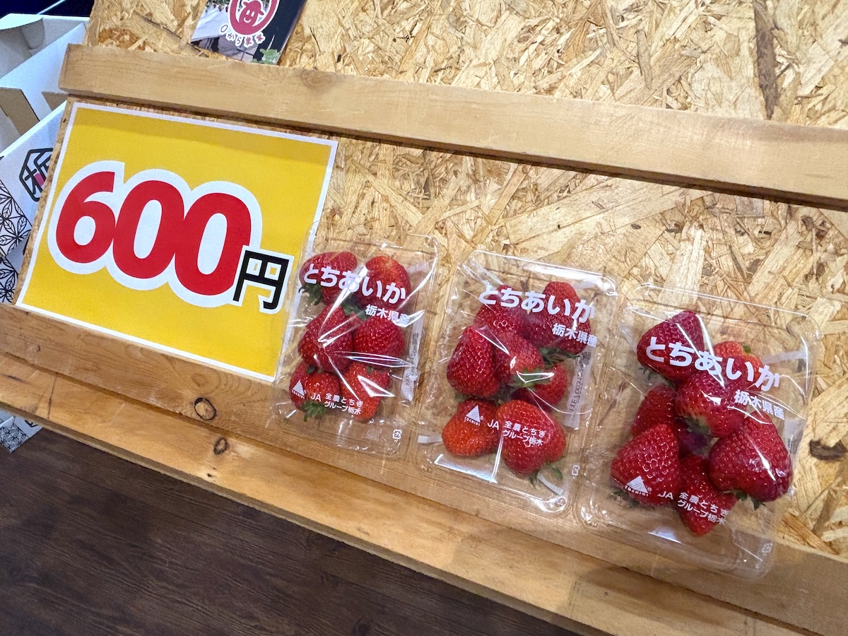 甘いいい香りに誘われ、次に足を止めたのは、0から農業さんが育てた地元日光で育ったいちご。ゼロから農業を始めた青年2人が作ったいちごは、まだ12時だというのに、残りあと3箱。栃木といったら、これも買うしかありませんよね。早速1箱購入し、その場で食べます。品種は「とちあいか」。今、栃木県イチオシの品種だそうです。私が住んでいるハノイでもいちごは売っていますが、路地ものが多く、ベトナム人の子どもにいちごのイメージを聞くと、「酸っぱい」という答えが返ってきます。日本の品種のいちごも手に入るようになっていますが、まだまだ高価。日本の甘いいちごを食べると、素直に美味しいなぁ、と感じます。