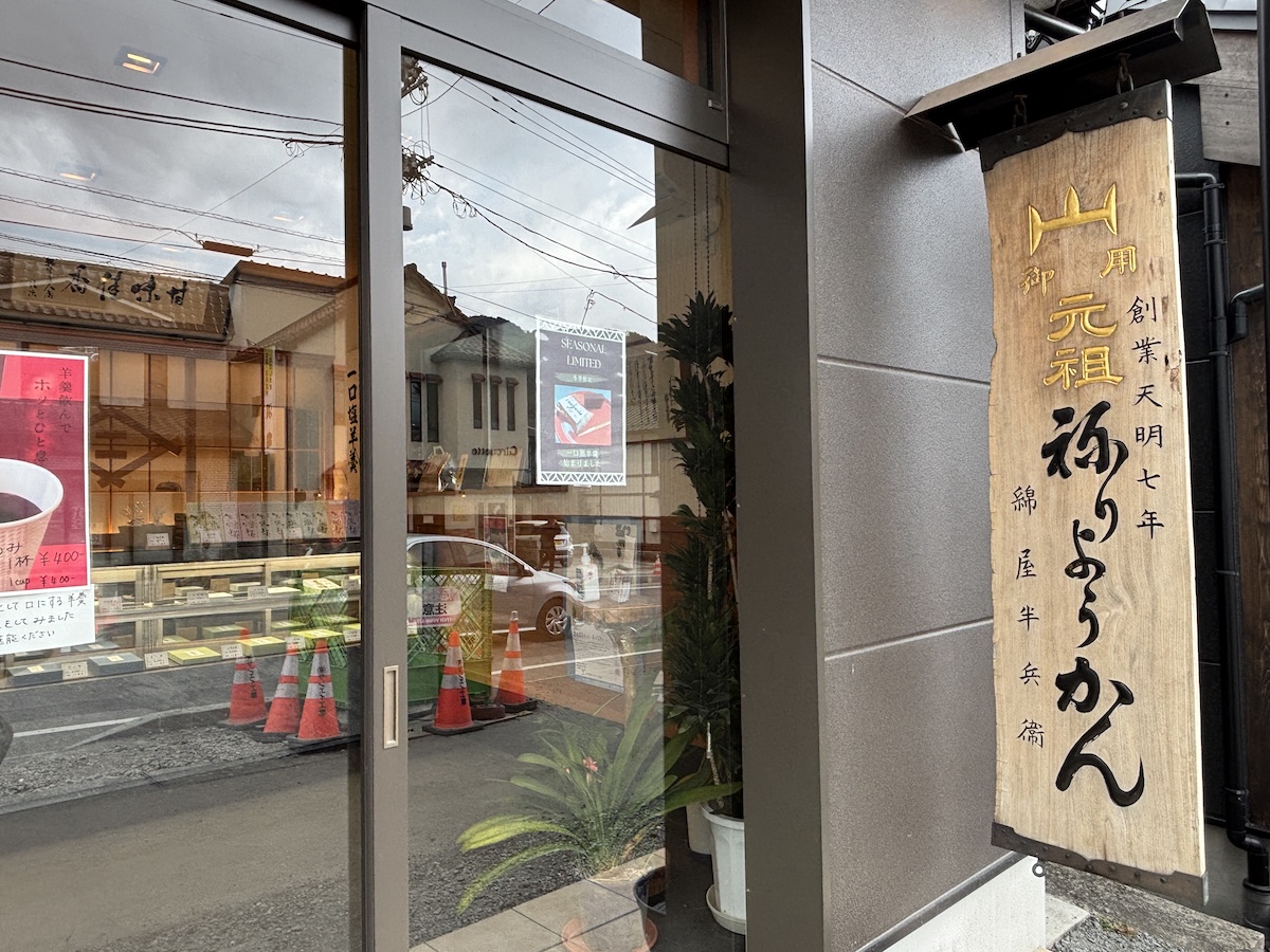 看板の創業天明7年の文字が光る羊羹屋さん。本店は別の場所にありますが、観光途中で訪れる場合は、駅近のお店の方が便利かもしれません。こちらの店舗ではイートインが可能です。せっかくですので、お店自慢の羊羹とドリンクのセットを頼みましょう。羊羹・和菓子は3種類、飲み物は、抹茶、煎茶、コーヒーから選べます。今回私は、抹茶と一口塩羊羹セットを注文。