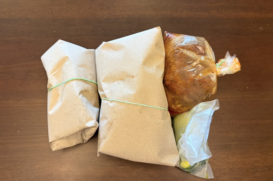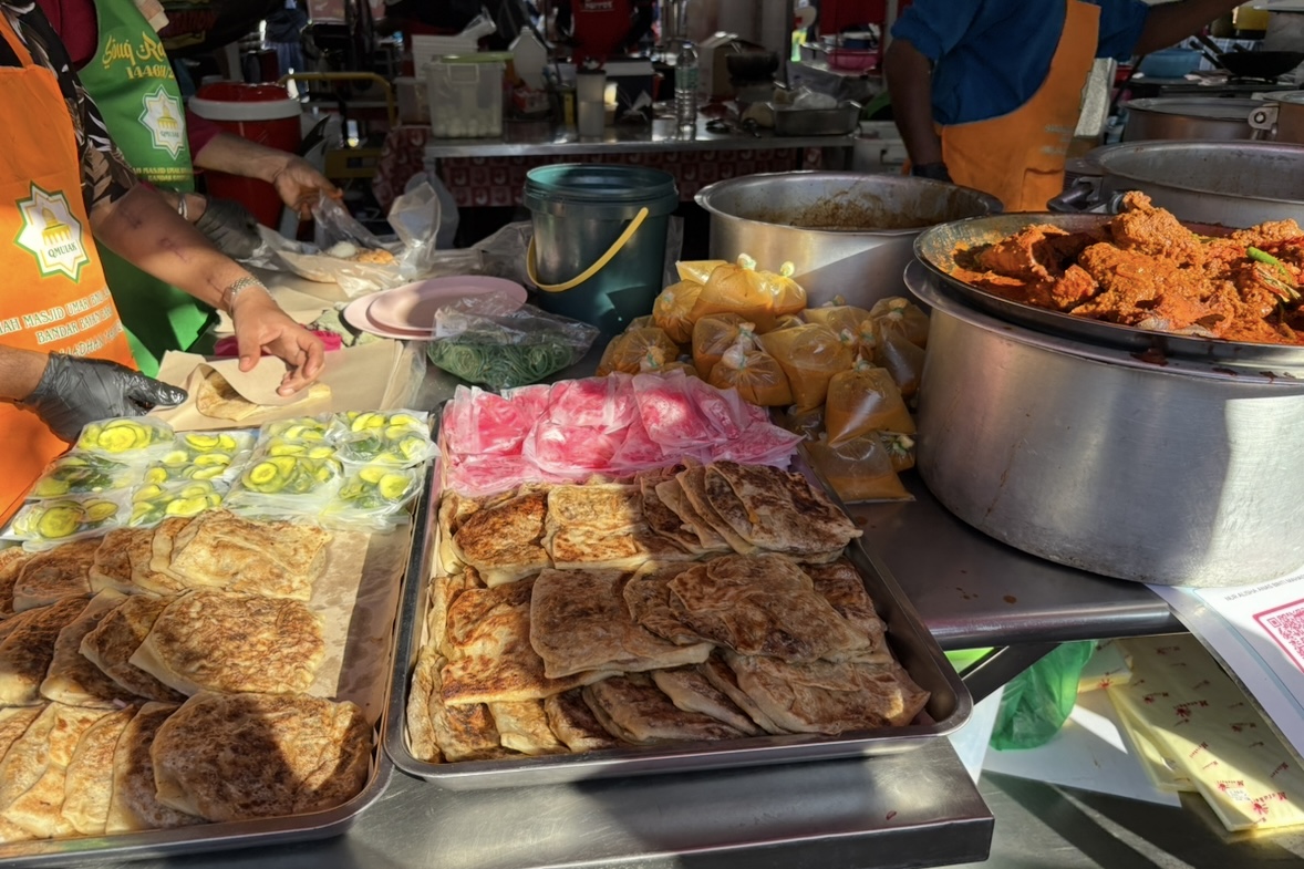 今回私はこちらのお店で夜ご飯を買うことにしました。ビリヤニと(Nasi Briyani)それに付随するおかずを売っているようです。こちらのビリヤニはインドのビリヤニのようにスパイスや肉と一緒に炊いたものとは少し違い、味がマイルドで基本的にお米とお肉は別で調理されます。黄色やオレンジに色付けされたお米と付け合わせのチキンのスパイス煮込みや甘酸っぱい漬物と一緒にいただきます。ここではムルタバ( Murtabak )という、ほんのりスパイシーに調理された卵や玉ねぎを薄皮に包んで焼いたものも売られています。中身はチキンと牛の二種類あるようです。今回私はナシビリヤニとムルタバのチキンを購入しました。支払いはRM15だったので日本円で600円ほどです(RM1=40円)。ラマダンの時期の食事は日没後と決まっているので、ラマダンバザールでは基本お持ち帰りになります。それぞれ包んで袋に入れてわたしてくれました。