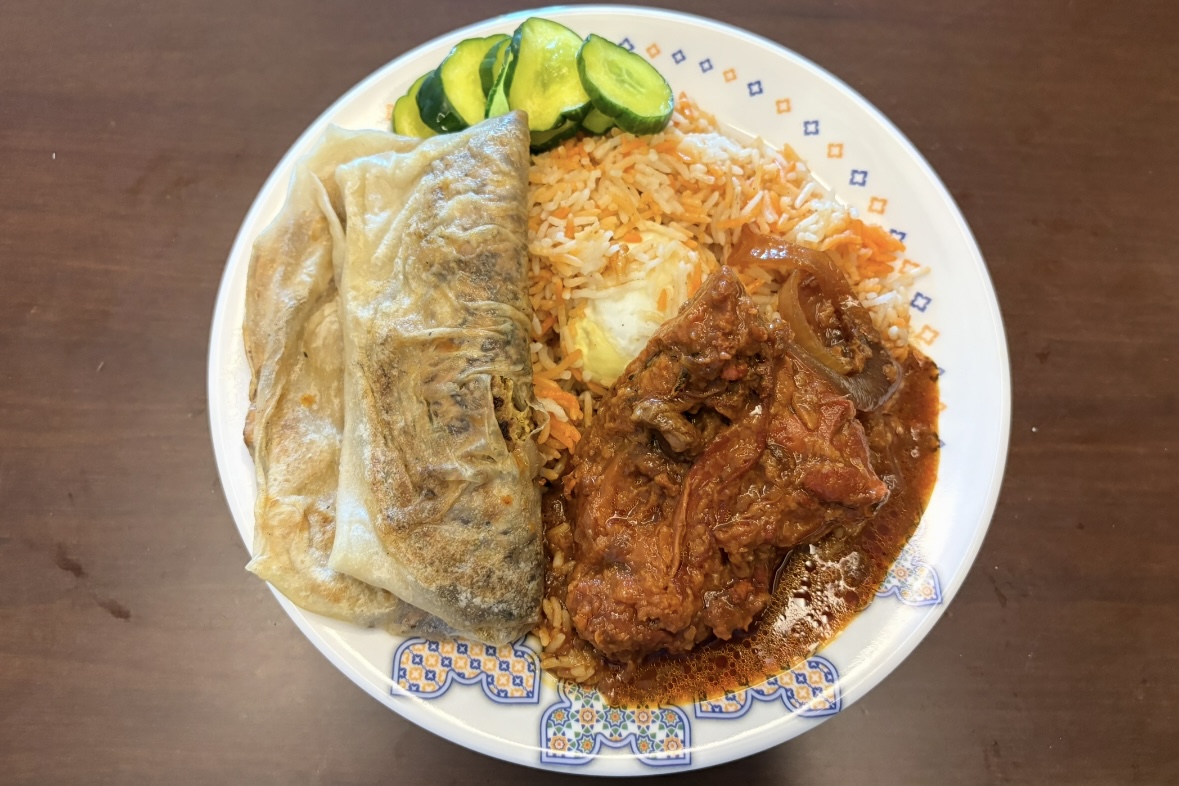 今回私が注文したのはビリヤニとムルタバですが、きゅうりの甘酸っぱい漬物とチキンのスパイス煮込みもセットでついてきました。家に帰ってお皿に盛りつけてみるとこんんな感じです。ビリヤニにはゆで卵もまるまる一個入っていました。ほんとうにボリューム満点ですね。