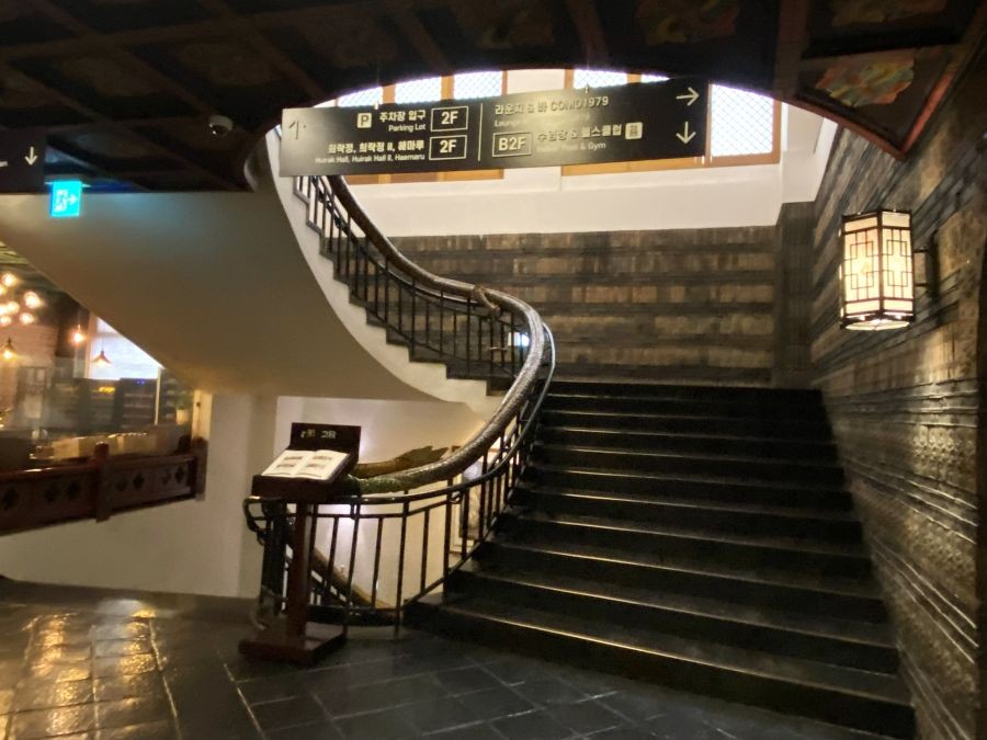 ホテル1階の入口を入ると、ロビー右手にフロントがあり、左手にはレンガ造りの壁に韓国の民話や伝説をもとにした壁画があしらわれています。天井は韓国の王宮の正殿などに見られる格子天井で、天井の暖色のダウンライトが印象的なロビーです。