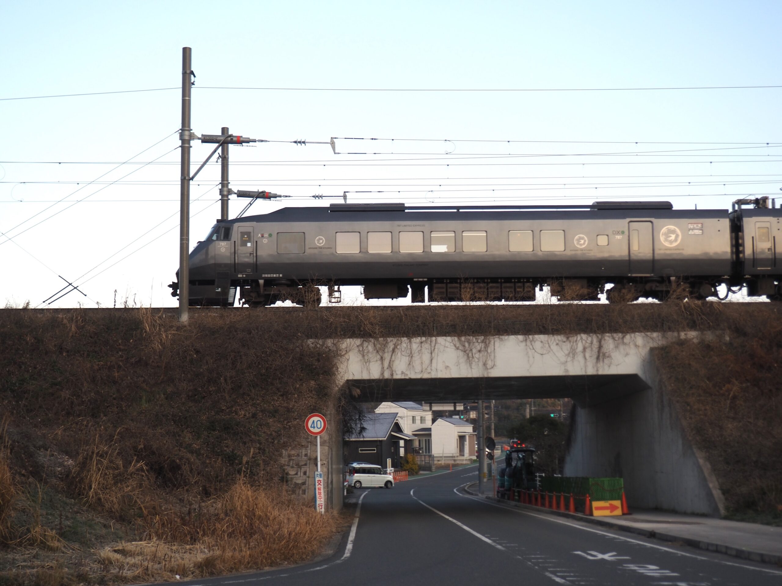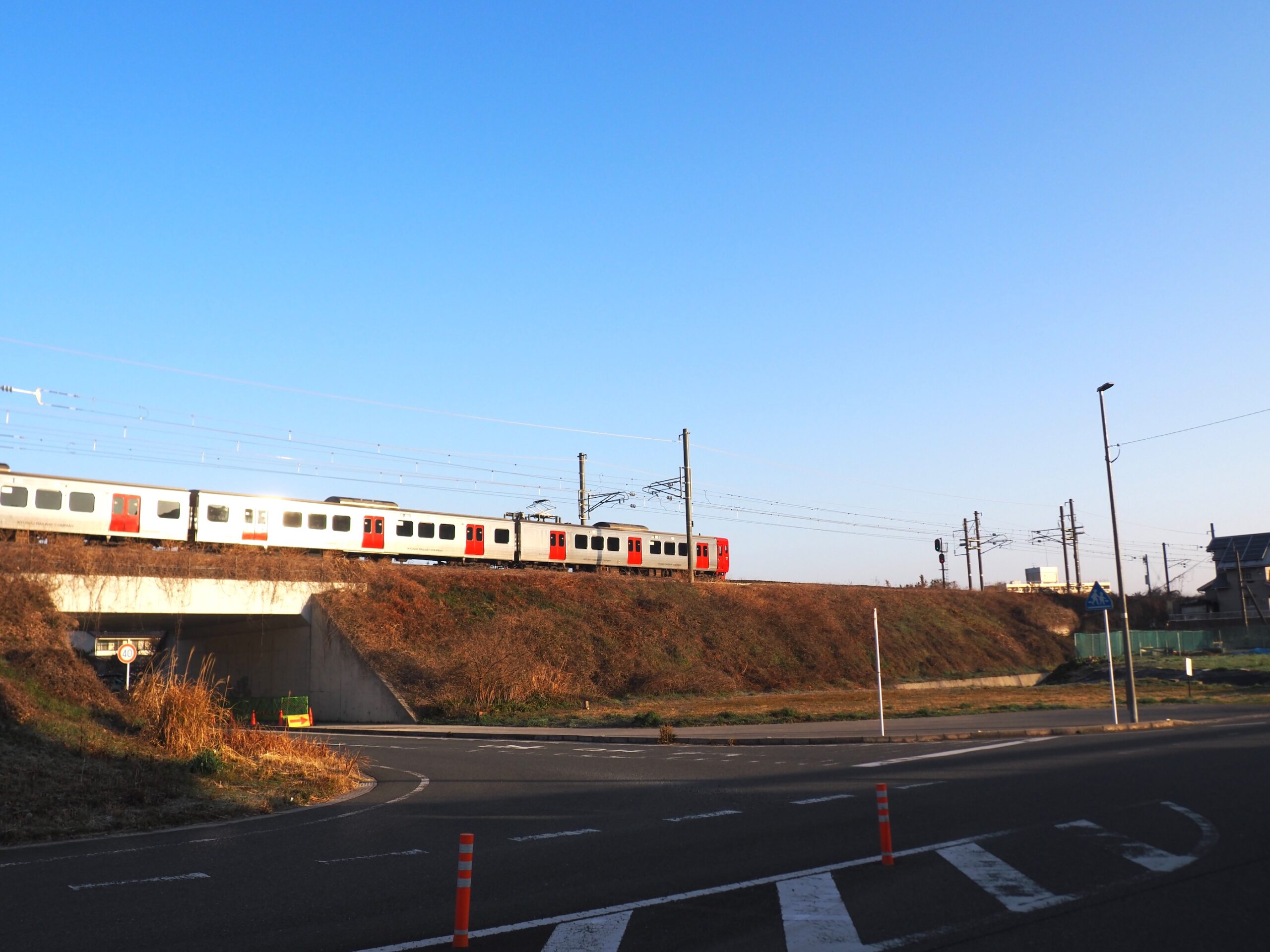 海老津駅を出てJR鹿児島本線を横目に目指します。途中で特急列車や快速列車・普通列車が何本も通るのでシャッターチャンスとばかりに撮影しました。お目当ての赤レンガアーチではありませんが、ここでも橋りょうが線路を支えていました。