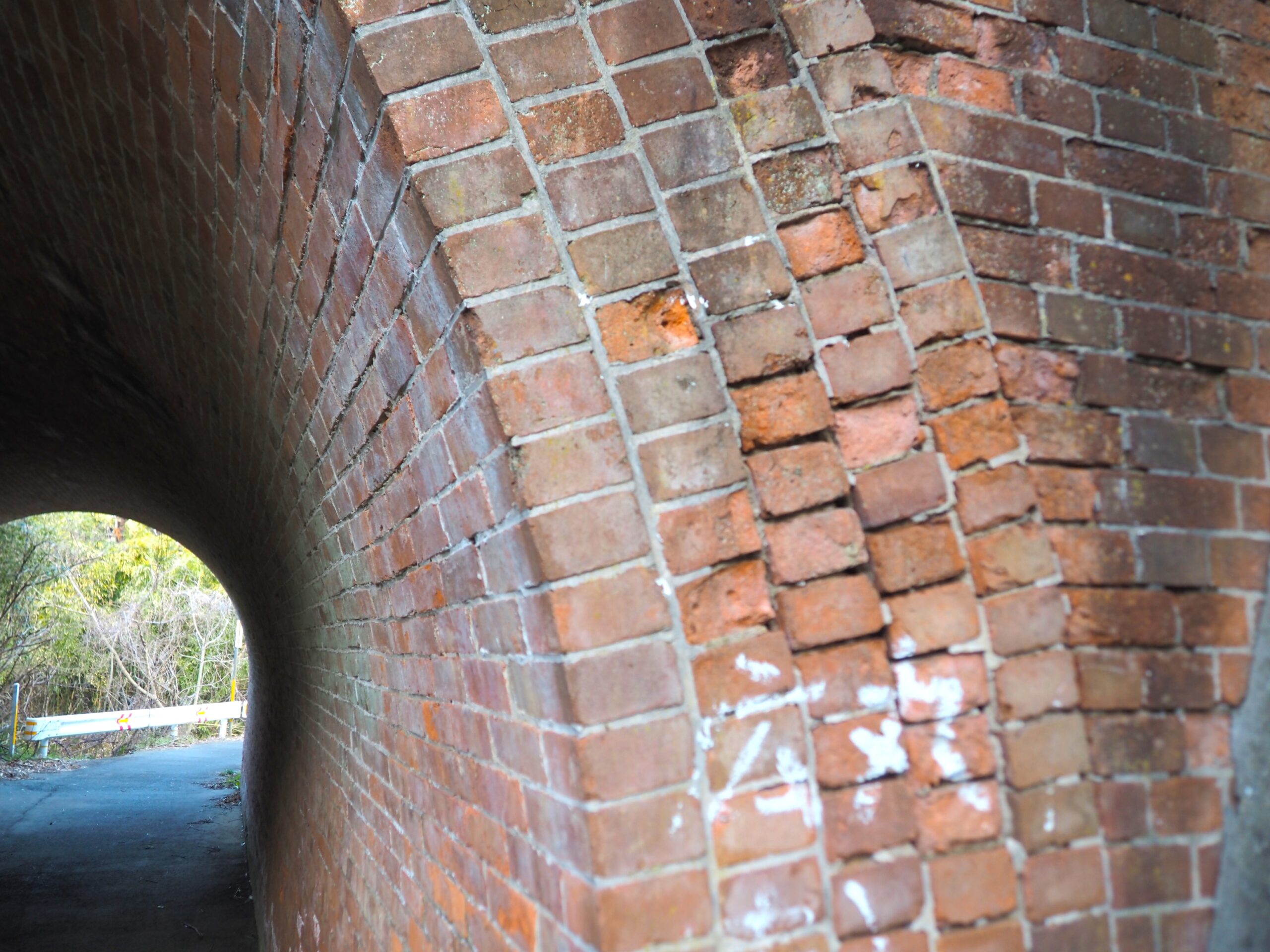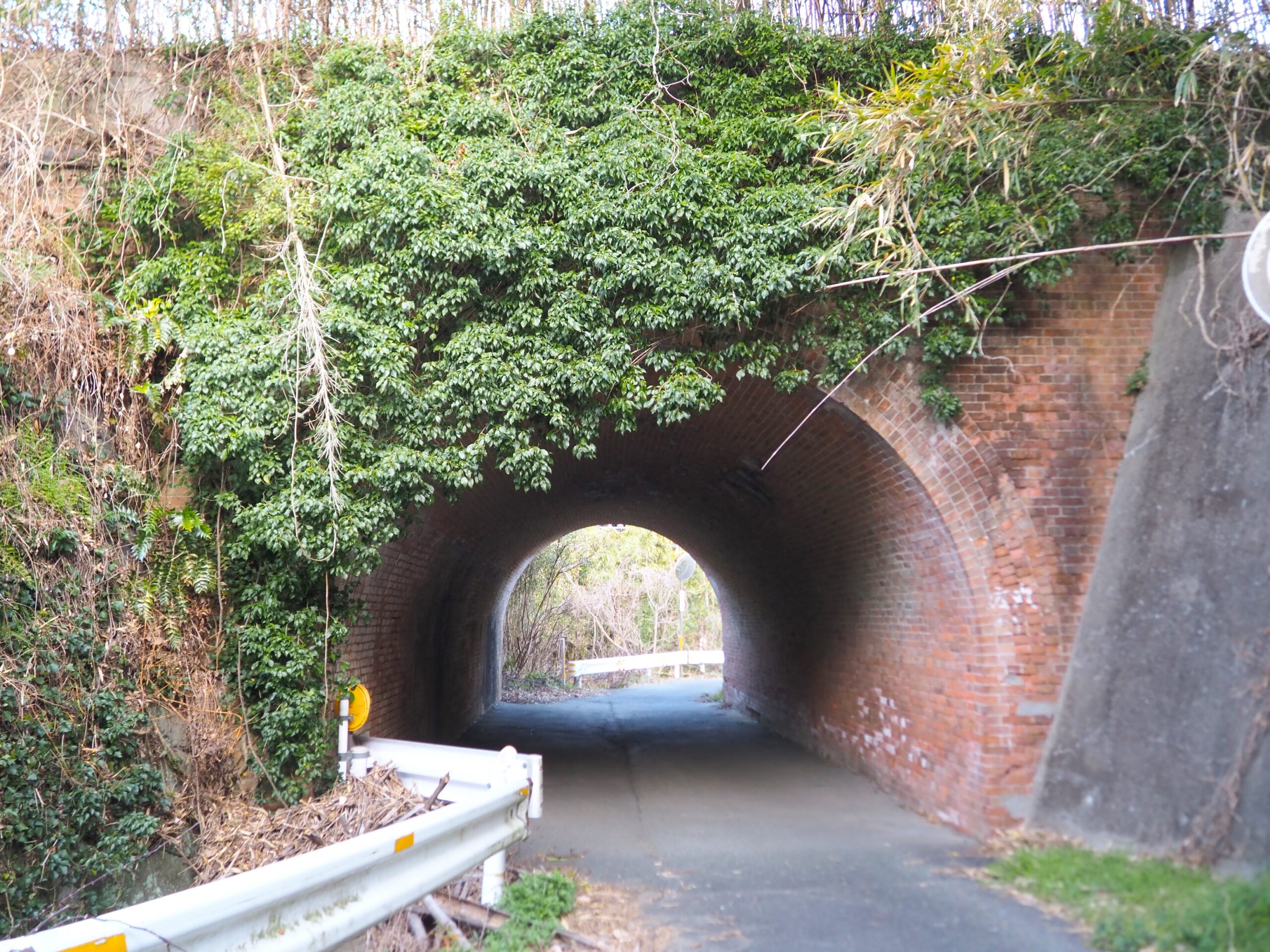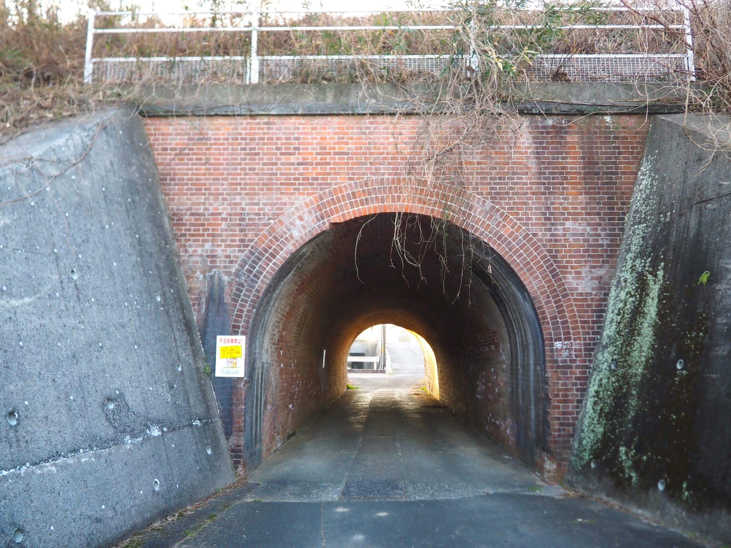 実はこの先に下り道があり、進んでいくともうひとつの赤レンガアーチ「煉瓦アーチ(広丸橋りょう)」があります。薄暗い場所ですが、ここはJR鹿児島本線線路の真下にあたり、現役で活躍しています。