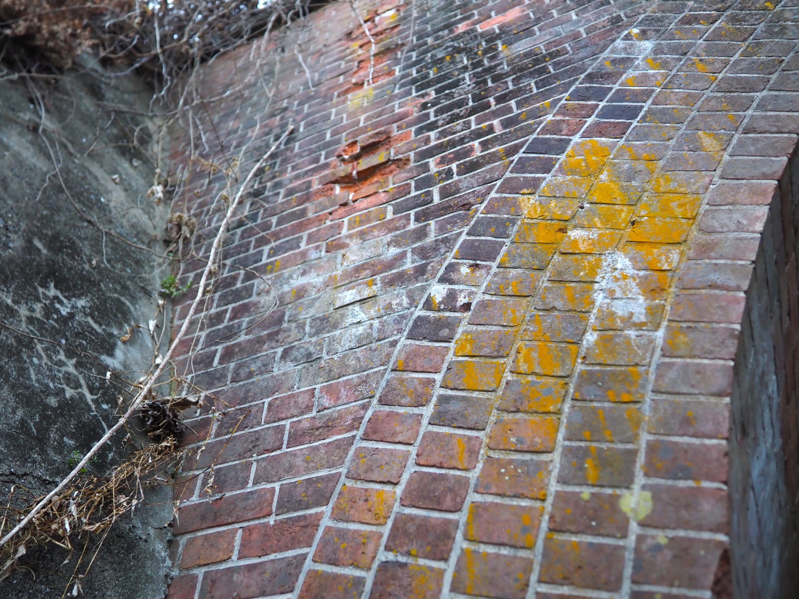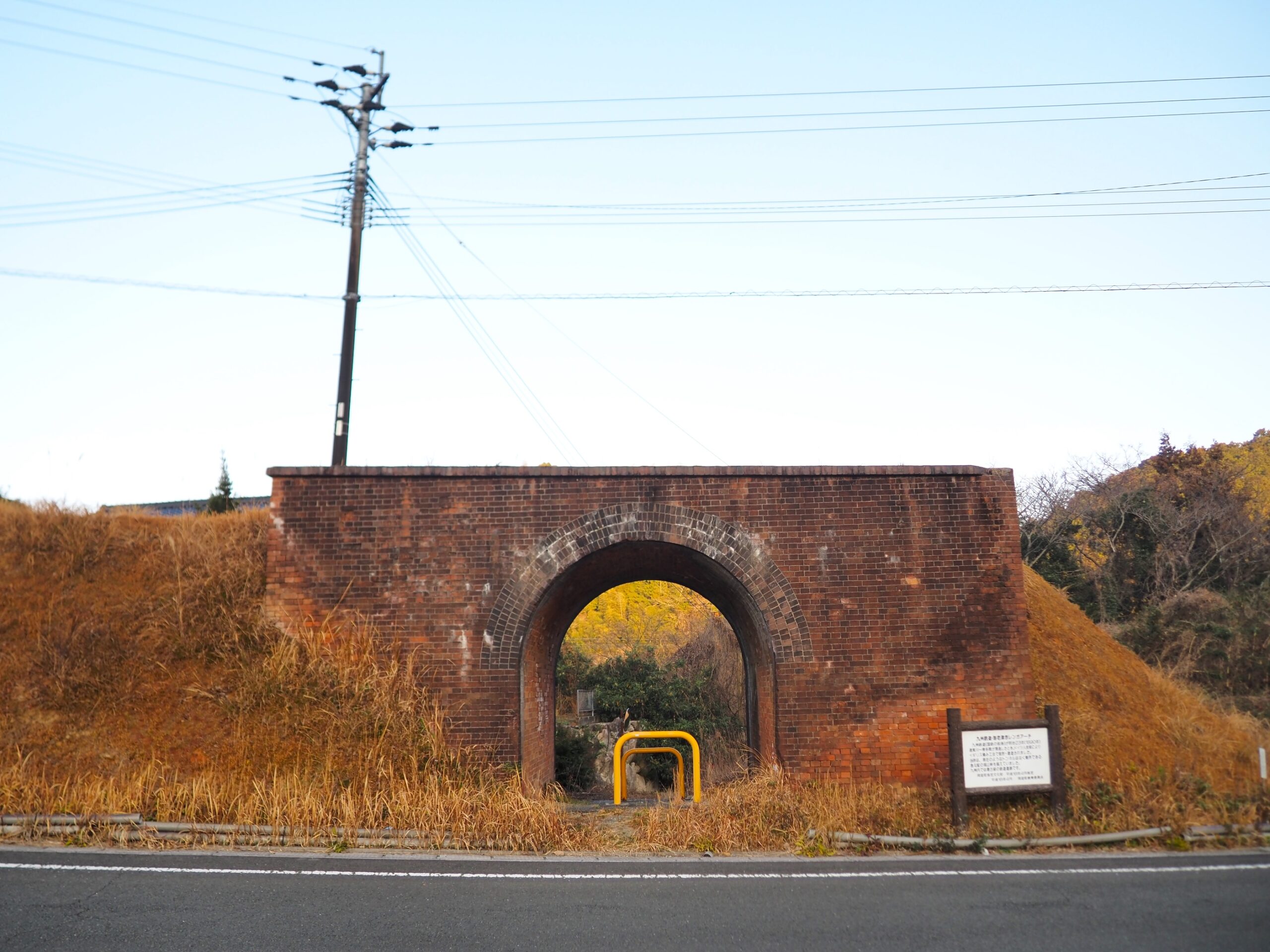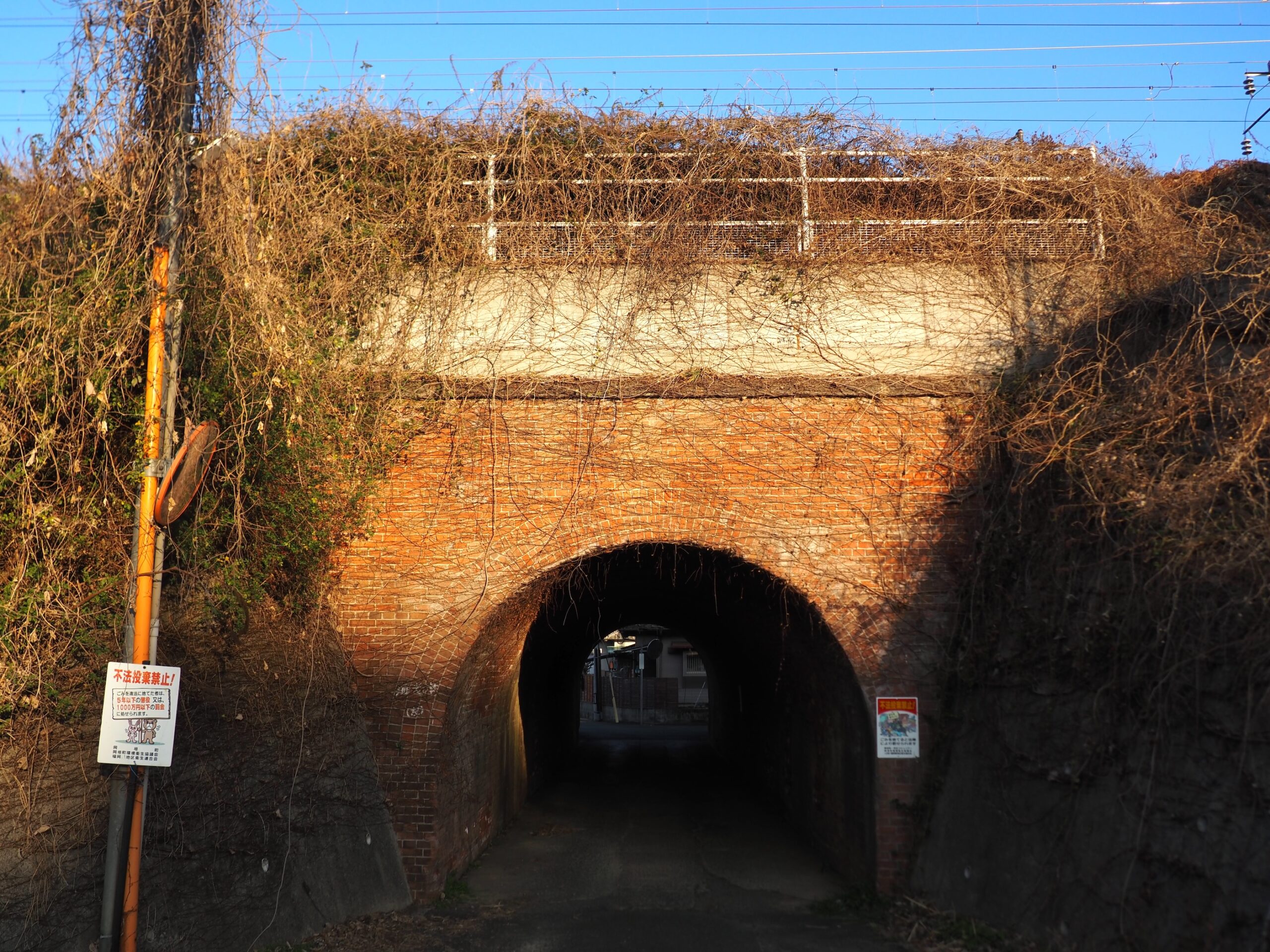 実はこの先に下り道があり、進んでいくともうひとつの赤レンガアーチ「煉瓦アーチ(広丸橋りょう)」があります。薄暗い場所ですが、ここはJR鹿児島本線線路の真下にあたり、現役で活躍しています。