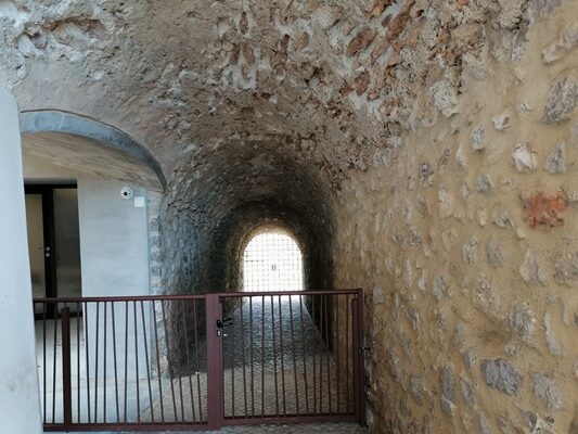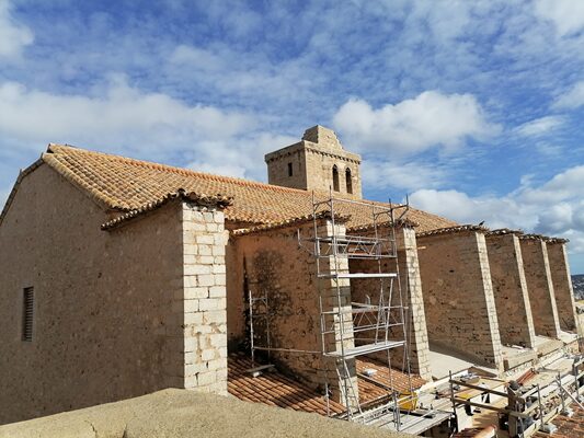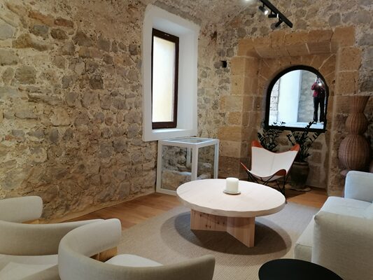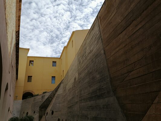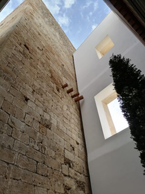 イビサのパラドールの基盤は、城と城塞で、主にカトリック王の統治下になってからの城と、市民戦争のときに建てられた軍事施設ですが、改修をする段になり、その下に埋まっていたフェニキア時代の壁(紀元前 7~3世紀)やローマ時代の塀やアーチが出てきました。確かに住居があったことが分かります。そしてイスラム時代の塔(12~13世紀)、キリスト教徒が建てた城壁(16~18世紀のルネッサンス様式)など、歴史的に価値あるものを確認、保存しながらの改修になったため、計画を立ててから18年の年月を経ての竣工となりました。