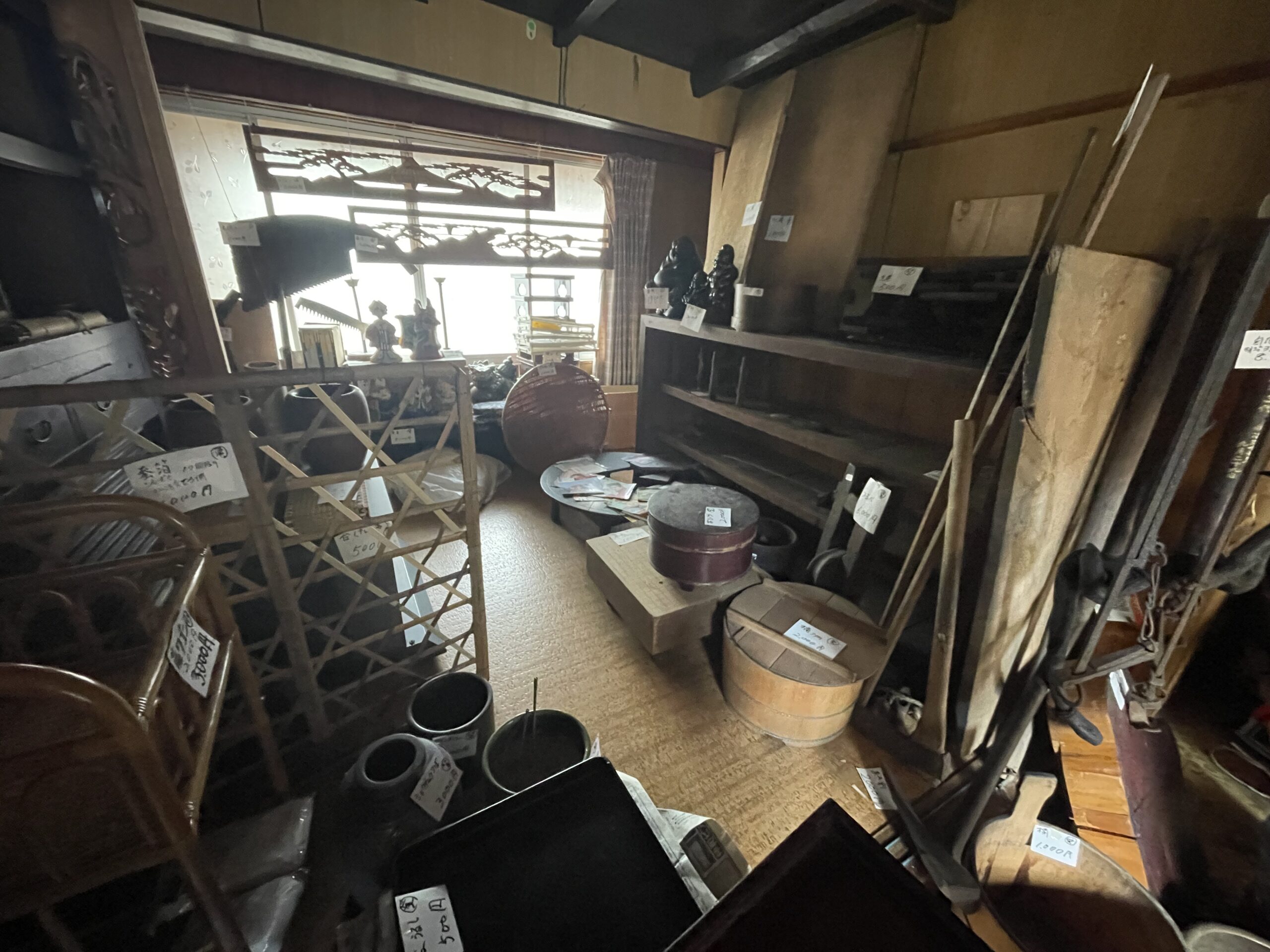 さらに進んでいくと、金山町観光協会が管理している物件に辿り着きました。こちらでは、以前の筋骨エリアの住人が残していった物品をセカンドハンド品としてお値打ちに販売しているとのことでした。この地域の空き家になった家屋を整理していると、このような物品が増えていく一方だそうなので、購入してくれる人がいれば助かる、とのことでした。現代ではなかなかお目にかからない掘り出し物、骨とう品などもお手軽価格で並んでいましたよ。まるで文化博物品を見ているかのようでした。