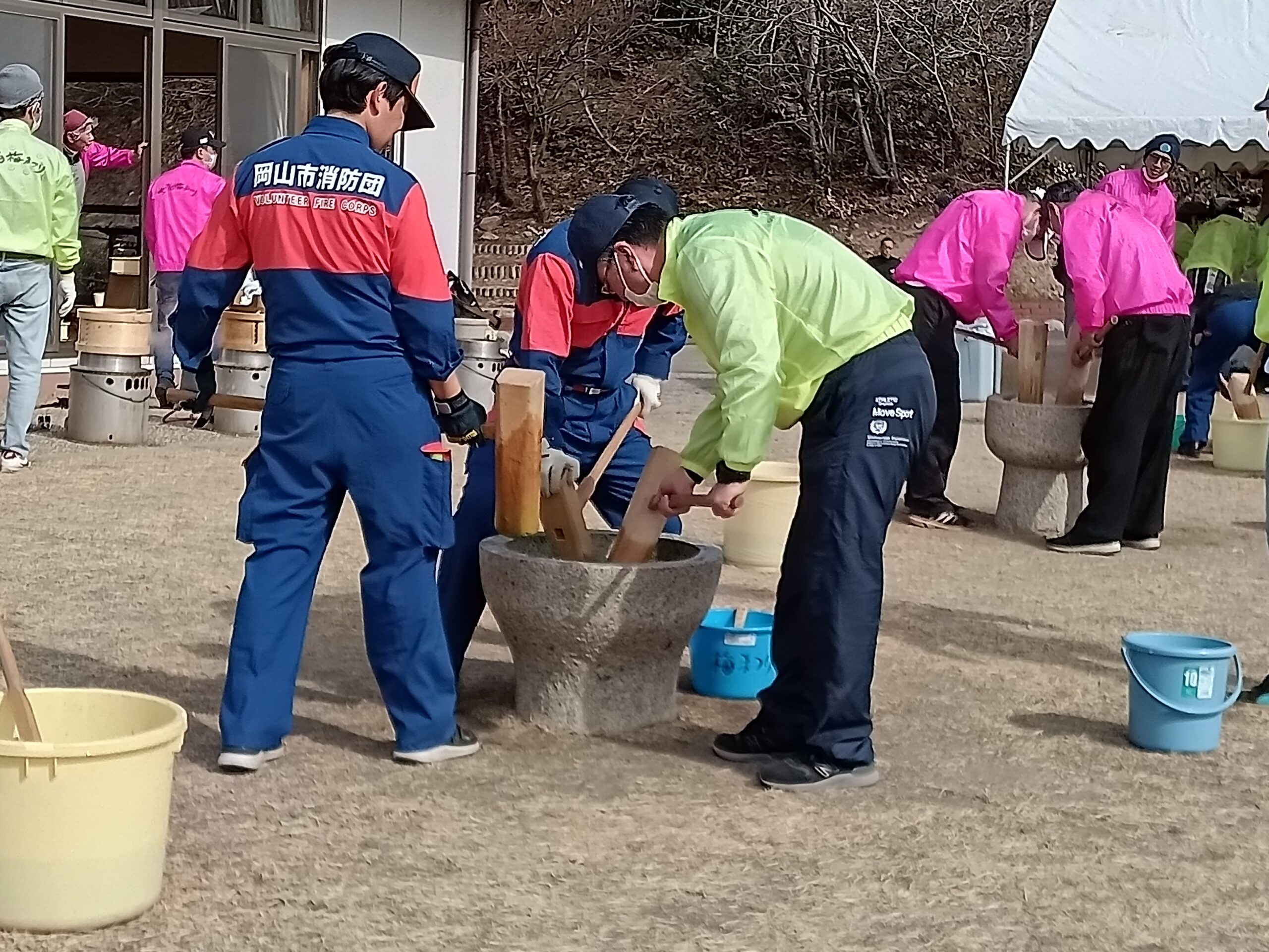 消防団の方々が石臼3台でお餅をついています。