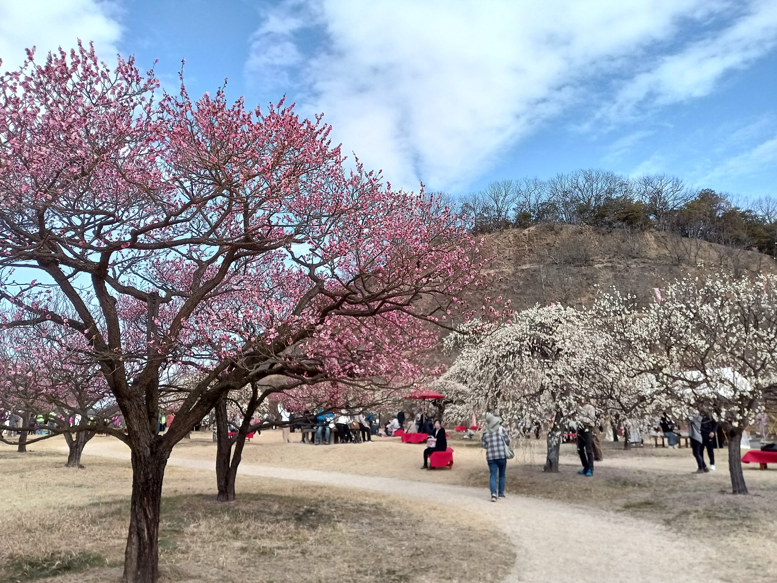 岡山市内の神崎梅園でも2月下旬に「太伯振興梅まつり」が開催されました。この梅園は、隣接する神崎緑地公園と合わせて「南高梅」「古城梅」など20種類以上500本もの紅梅・白梅・しだれ梅が咲き継いで、長期にわたり梅を楽しめるのが特徴です。