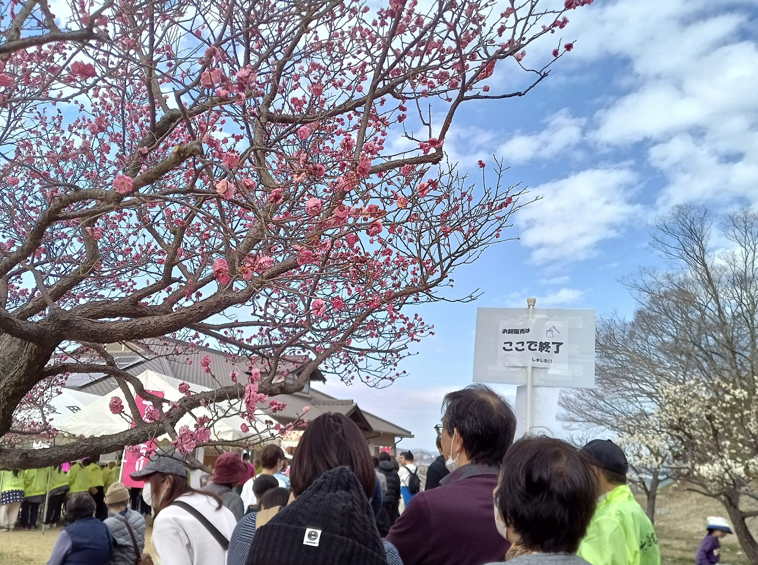 この行列は、名物のよもぎ餅の販売です。 ”花より団子”の私は、もちろんこの最後尾に並びます。前方に「ここで終了」のプラカードを持った人が立っていましたが、終了看板の後ろは「訳あり商品があるかも…」という事で並んでいます。
