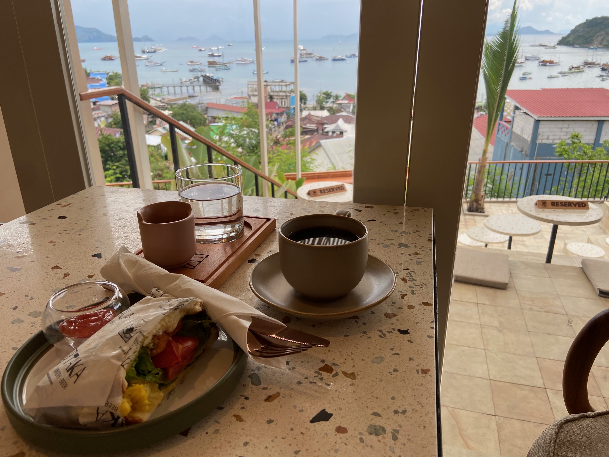 こちらは、2025年にオープンした海が見えるカフェ。ラブアンバジョ市内にありますが、メインストリートから坂をのぼった途中にあるので、徒歩だと少し不便です。中心地からの距離は近いです。