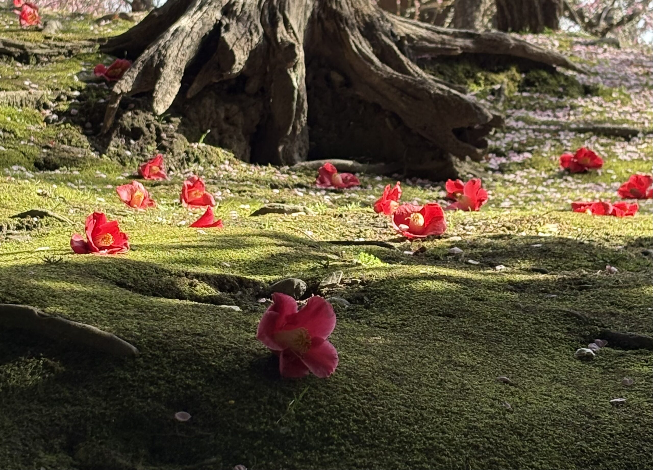 薄紅のしだれ梅、緑の苔、そして深紅の落ち椿。この三者が一枚の絵のように重なった光景が城南宮を代表する景色です。奥には淡い紅白のしだれ梅、足元には苔の上に落ちた椿の赤い花が目に留まり、視線を上げても下げても春の色が広がります。