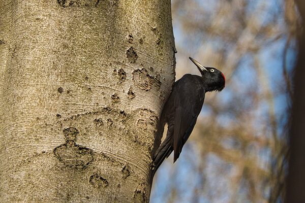 さらに歩き進めていくと、独特の「コンコンコン…」というドラミング音が響いてきました。足を止めて音のする方をじっと探していると、真っ黒な大きな鳥が幹をつついています。