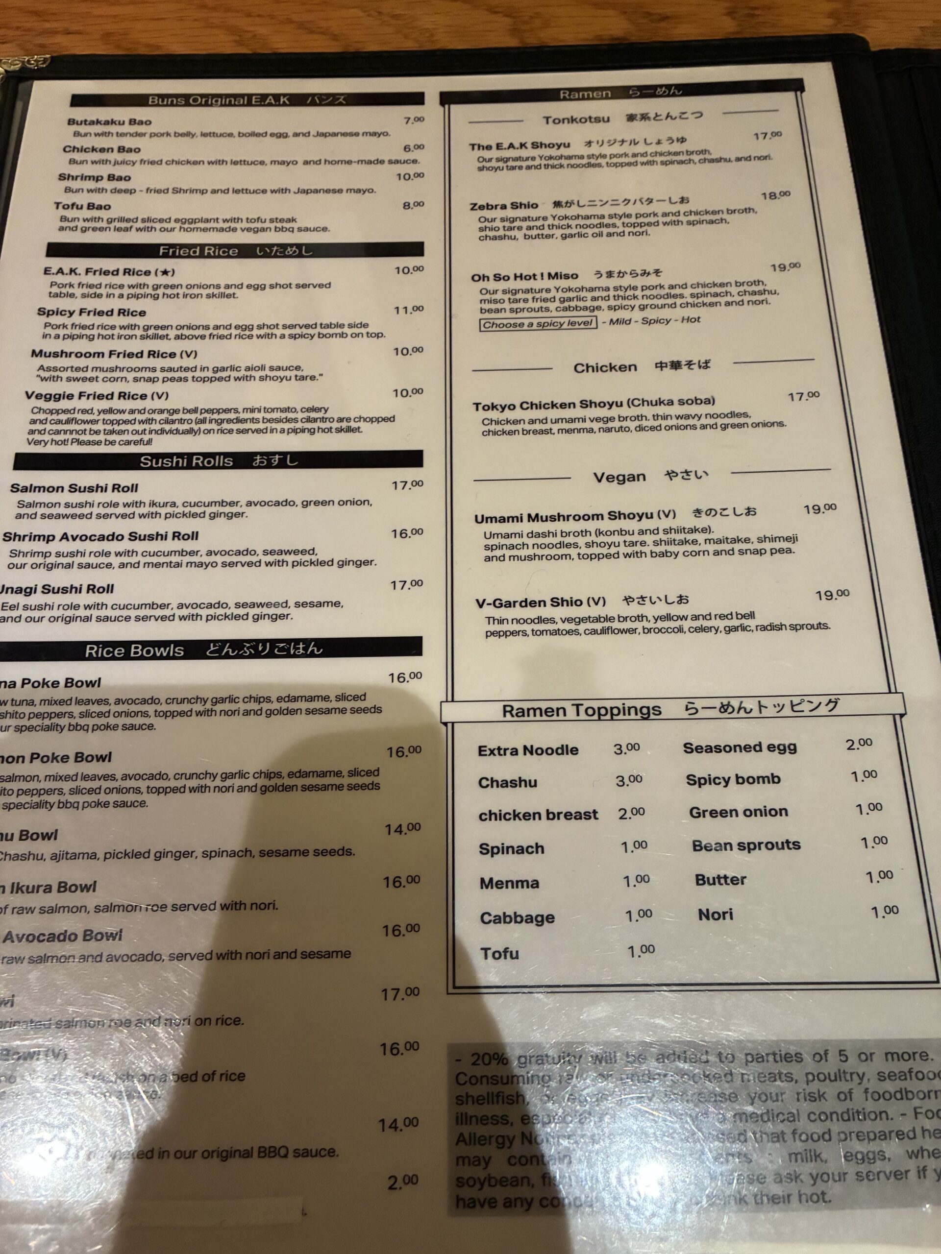 ニューヨークのラーメンは、やはり日本と比べると価格が高めです。E.A.K. Ramenでも、ラーメン1杯の価格は次の通りです(ヘルズキッチンの店舗の値段)。
